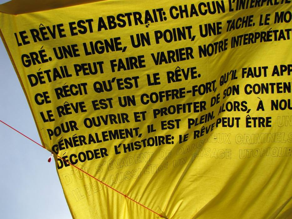 During the meetings, dreams are exchanged, shared, mixed, interwoven, to create texts to print on sheets of color. Follow nap periods by using these sheets/texts as blankets. They are used for what they are, simple sheets, but also as decorative elements to be hanged on the clotheslines of an alley, or to create temporary tents in front of the trailer-office of DARE-DARE. The goal here is to inject dreams into the collective sphere and to use them as vehicles or witnesses of common experiences.