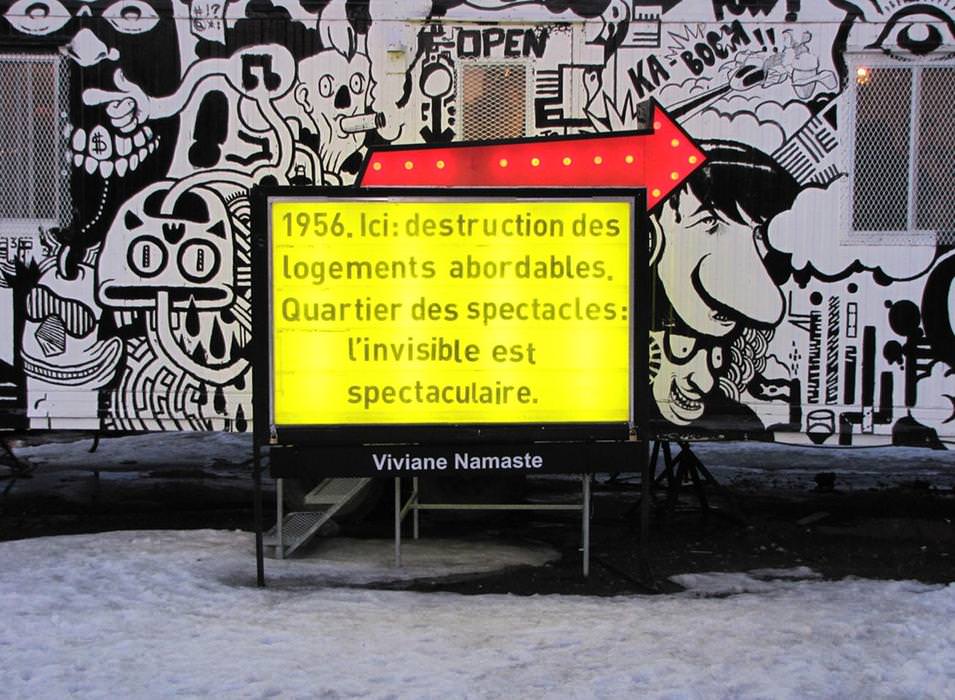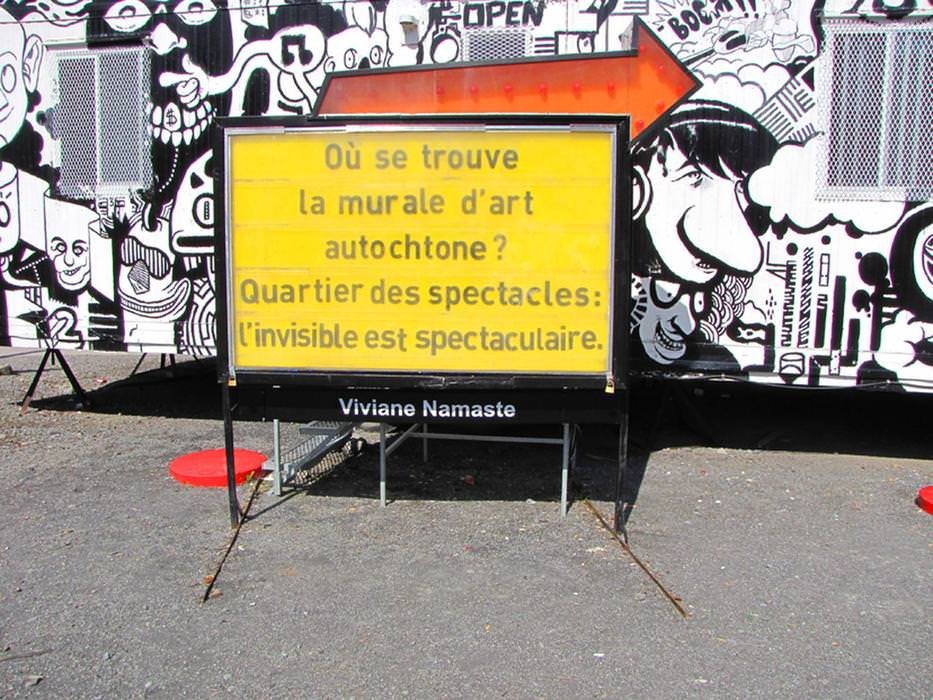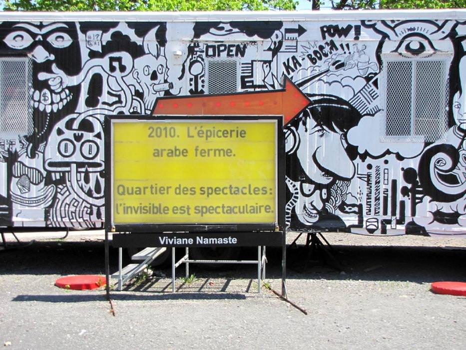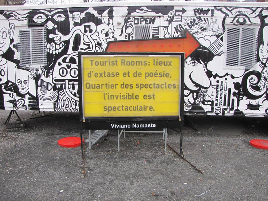 As Montréal enacts its marketing through the Quartier des spectacles, a promotional slogan is proposed to undo the perverse effects of the transformation of this site: "Quartier des spectacles : What’s invisible is spectacular". Repeated each week, this slogan is written with each of the ten statements, suggesting that the definition of a site cannot limit itself to the visible, but must base itself on the invisible as well. Better still: the enunciation of a site is founded on the repression of certain histories and certain statements. Within such a violence, the referents of signs are displaced, abandoned, erased: "Quartier des spectacles" designates a large festival, an open air concert, urban design which allows for thousands of people to move through public space, but "Quartier des spectacles" no longer refers to a country singer from the Main, the store where artists bought materials to make their costumes, or the Tourist Rooms where the artists and workers of the neighbourhood slept and made love. As such, the repetition of the slogan "Quartier des spectacles: What’s invisible is spectacular" demands that we reflect on what we do not see in the neighbourhood – the displacement of poor people, the expulsion of sex workers, unemployment among popular artists of the area. Writing here invites us to see, and re-view, otherwise. The neighbourhood is spectacular not only for its visual shows, but especially for what we do not see. The writing of a promotional slogan underlines these invisibilities and erasures.