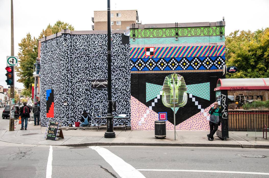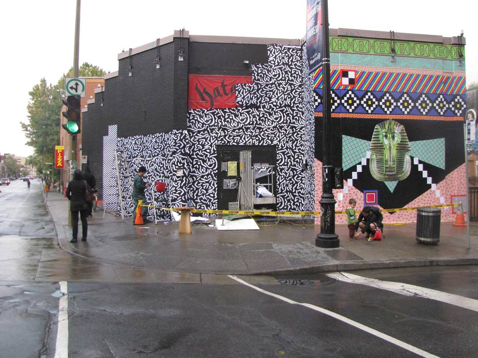 PALAZZO II est un projet monumental de l’artiste visuelle Dominique Pétrin qui consiste à recouvrir de papier imprimé et découpé la surface extérieure de l’immeuble des Katacombes. Cette installation éphémère est réalisée à partir d’impressions sérigraphiques originales conçues par l’artiste. Ce projet d'envergure a été rendu possible grâce à l'appui du Partenariat du Quartier des spectacles.
