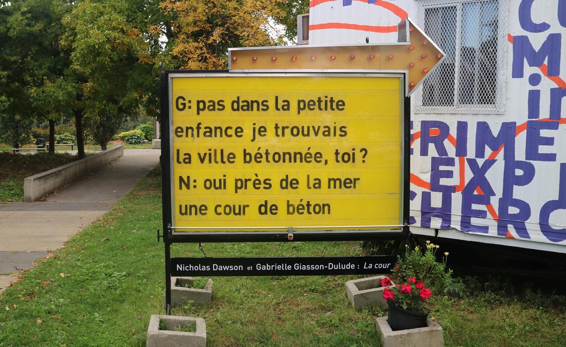Après avoir séparément investi l’espace public de DARE-DARE pendant plusieurs mois, Gabrielle Giasson-Dulude (G) et Nicholas Dawson (N) amorcent leur duologie en installant progressivement une cour poétique commune à partir de celles connues tout au long de leur vie.