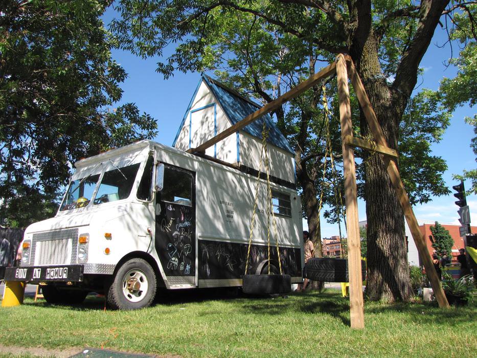 Grumman 1974. Transmission manuelle. Une structure mobile qui encadrera l'imprévisible. Blanc, avec des espaces peinturés en tableau noir; une invitation à y laisser des mots.