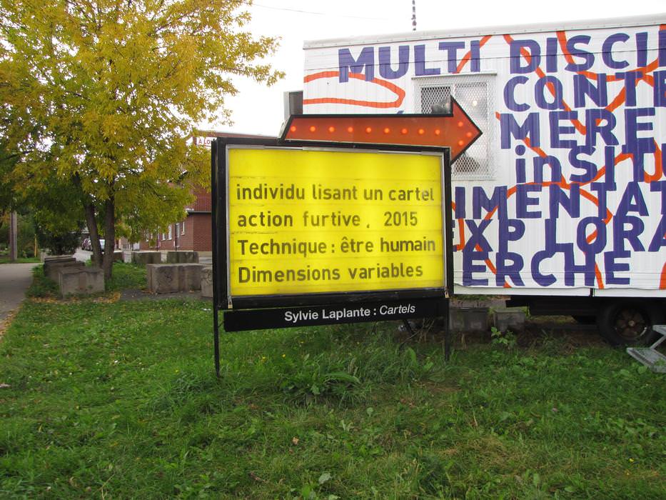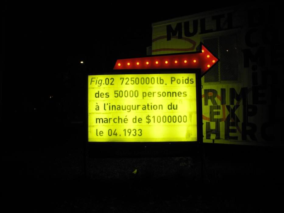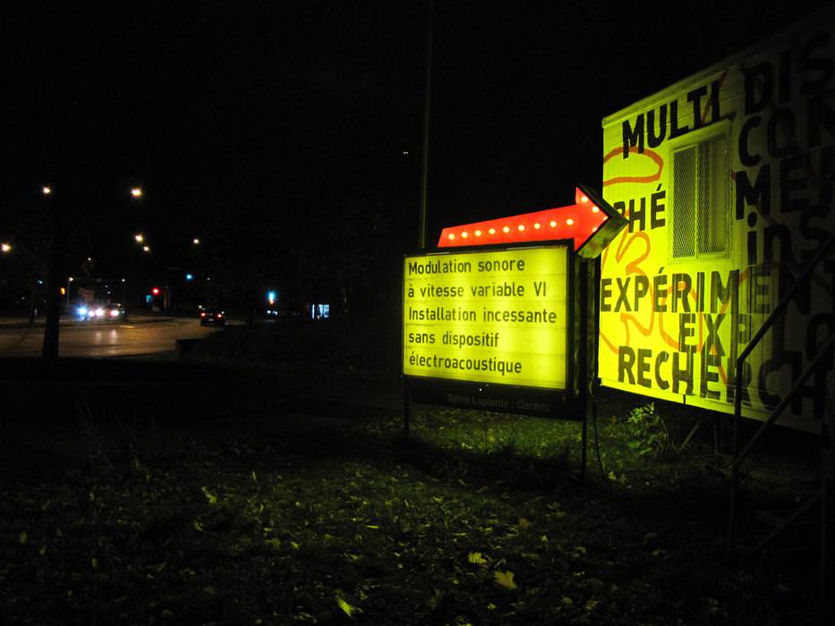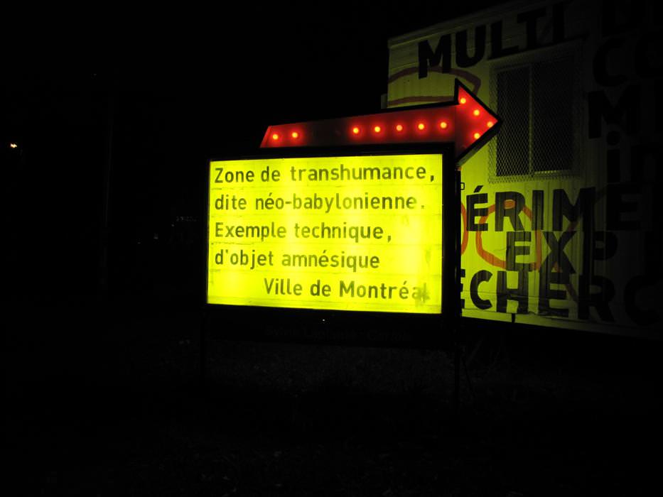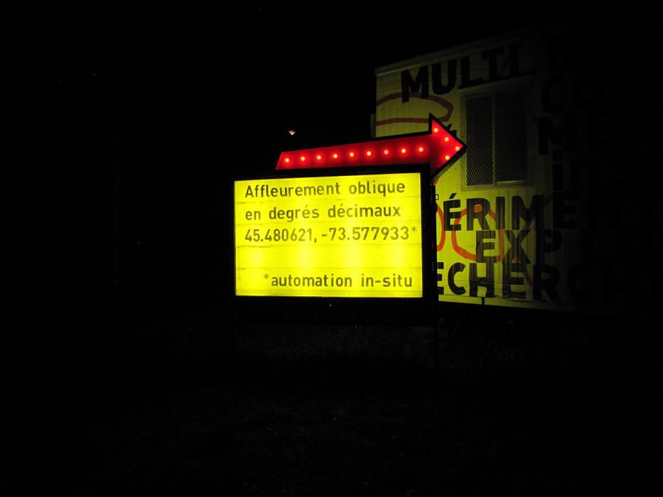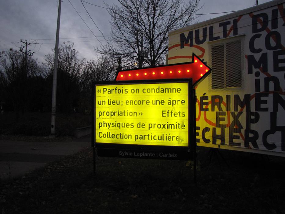 Je me suis mise face à l'espace qui contient le panneau. Des questions ont surgi telles des petites sollicitudes, des défis et propositions de jeu. Cela ressemblait à des débuts de dialogues. Le lieu m'est apparu comme une œuvre formelle, un tout suspendu; le panneau lumineux devenu le cartel qui accompagne une œuvre qui s'expose.