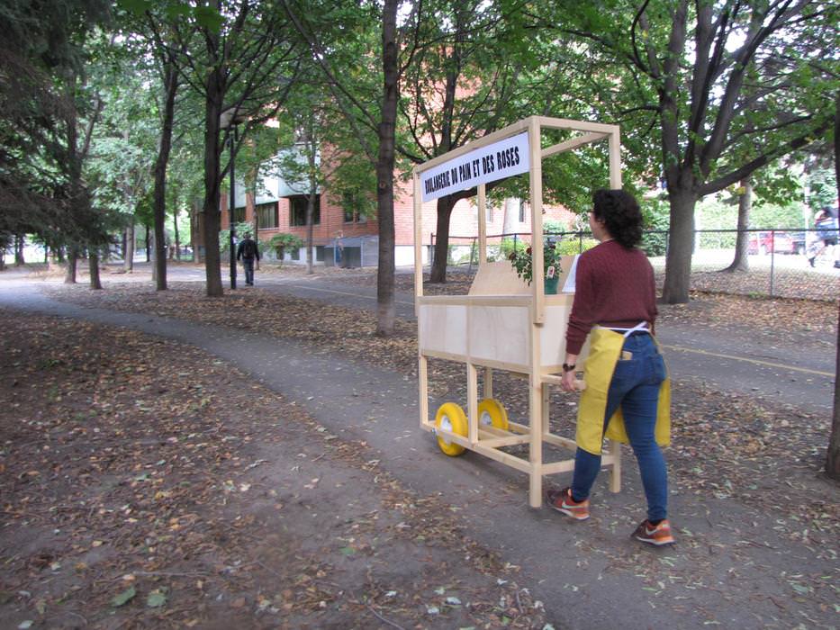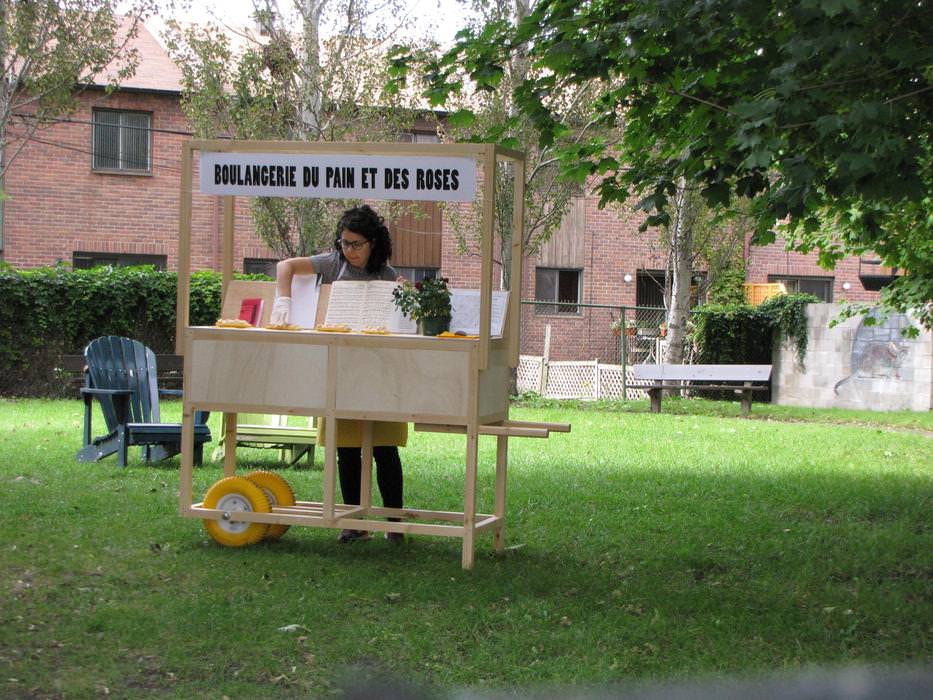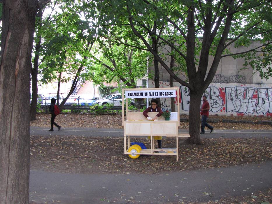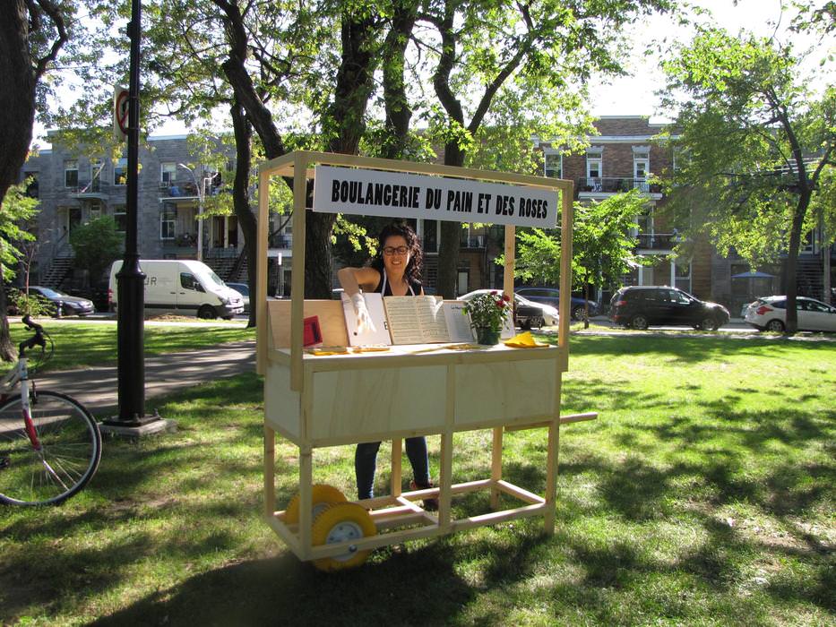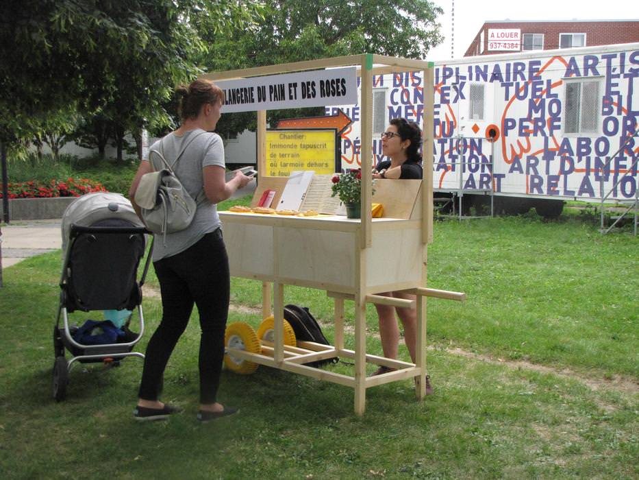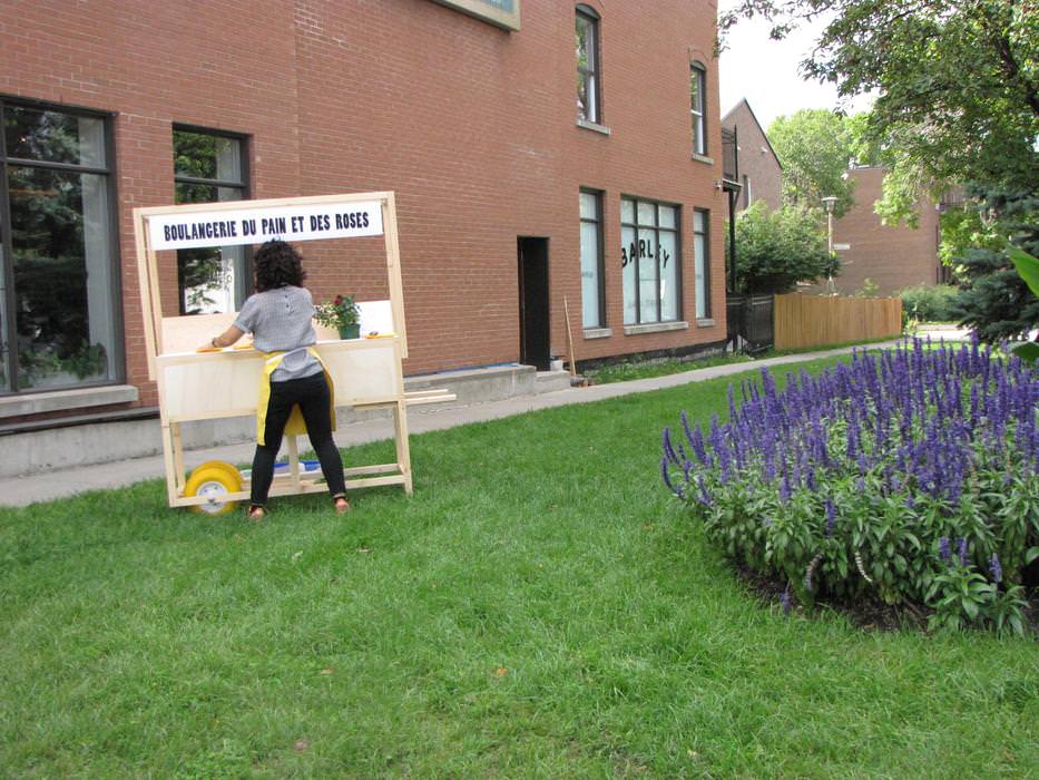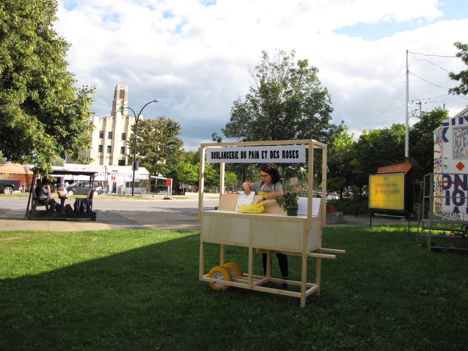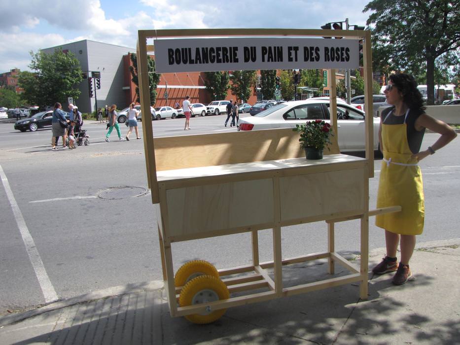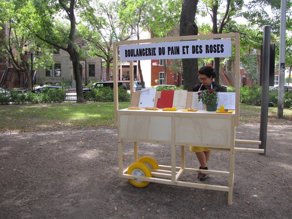 The Bread and Roses Bakery is a mobile platform to encourage discussion in public spaces about the working conditions of artists and cultural workers in the Saint-Henri district, through bread and other artistic events. Following the deindustrialisation of Montreal, which began in the 1960s, artists replaced workers in several industrial buildings by using them as workshop spaces. However, with the gradual increase in rents that operates in the neighborhood, as in other parts of Montreal, workshops located in, among others, the RCA and the Lachine Canal Complex are becoming less and less affordable, an essential component to be able to work. The slogan "bread and roses", chanted in several workers' popular struggles of the 20th century, and taken up again in 1995 at the March Against Poverty organized by the women's groups of Quebec, is still valid to claim better conditions of work for the artisans of culture. As an artist, we ask for bread, but also for roses, which is a higher quality of life related to our livelihood.