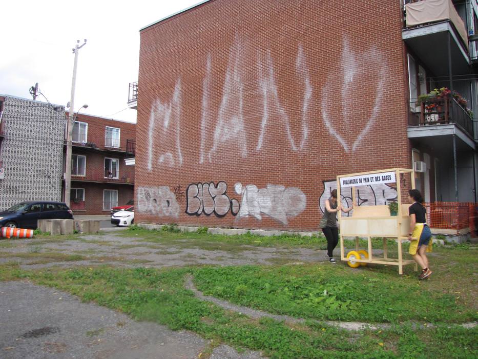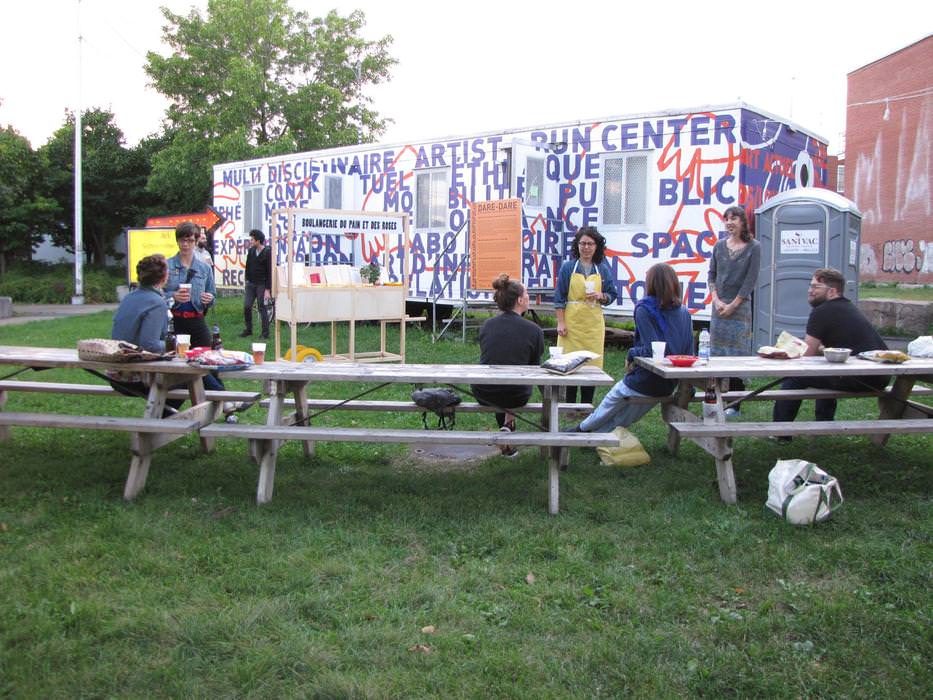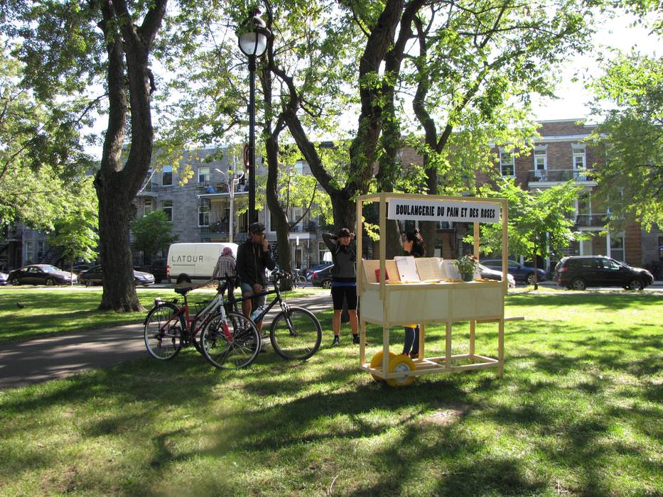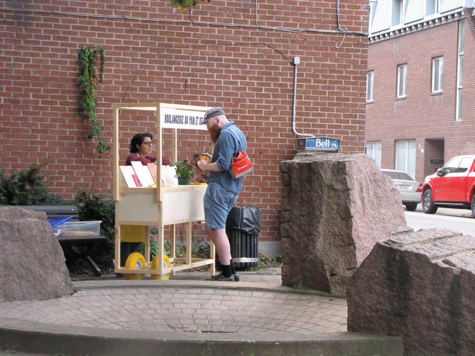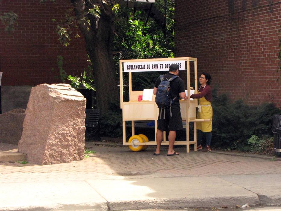 The project is a mobile platform to encourage discussion in public spaces about the working conditions of artists and cultural workers in the Saint-Henri district, through bread and other artistic events.