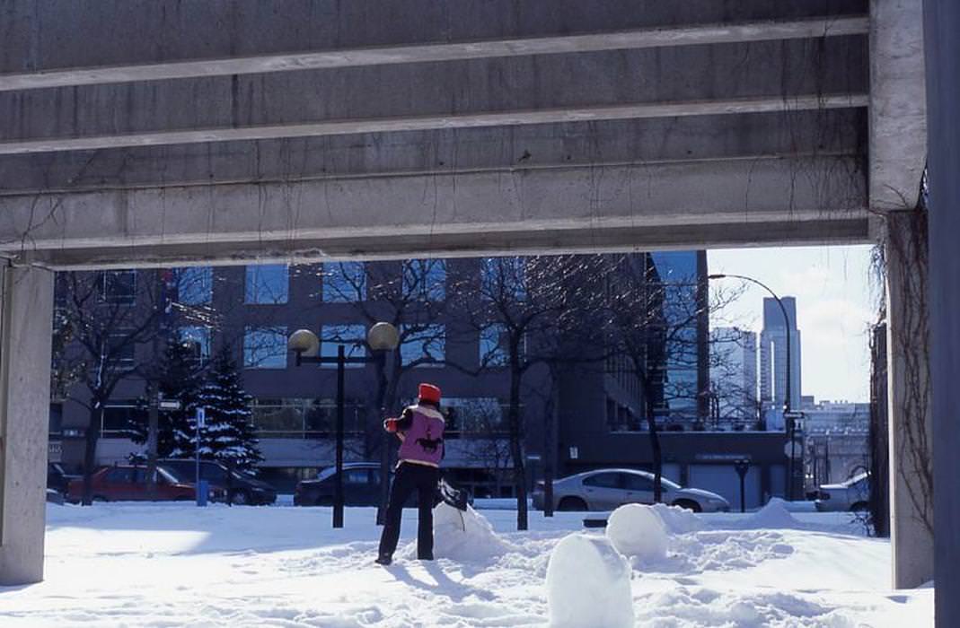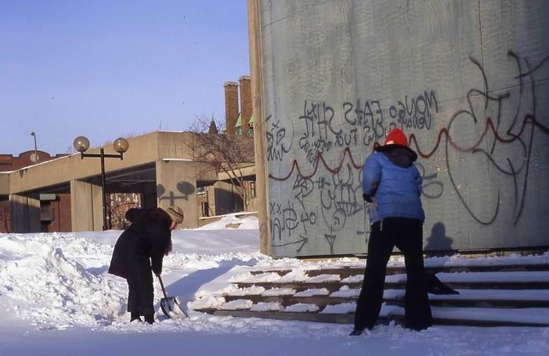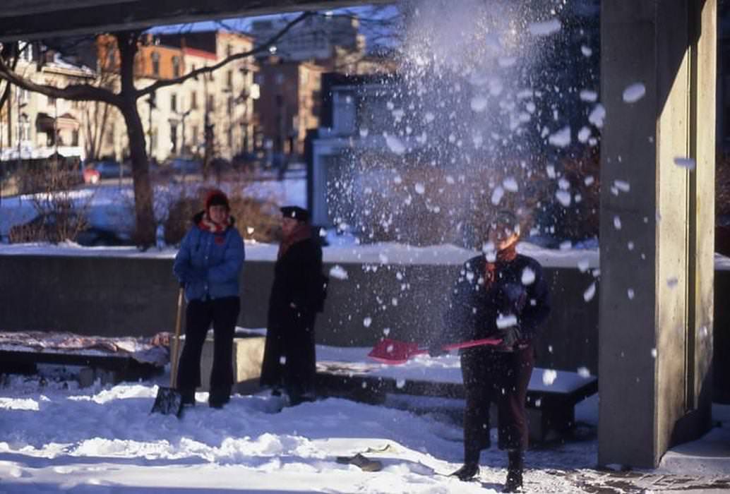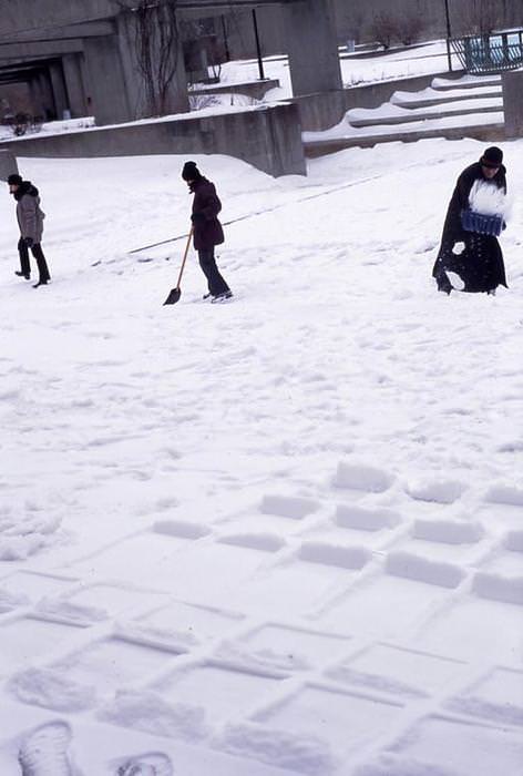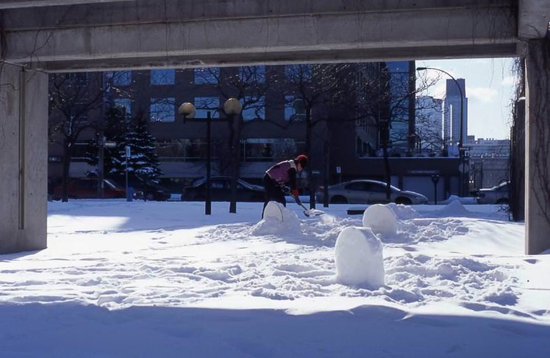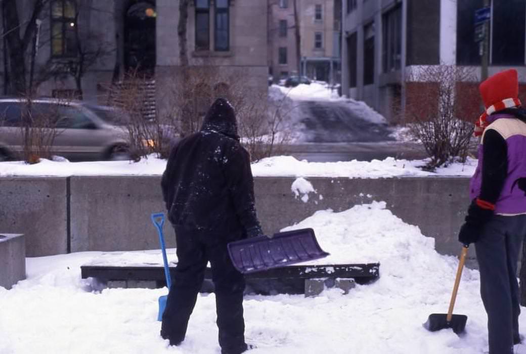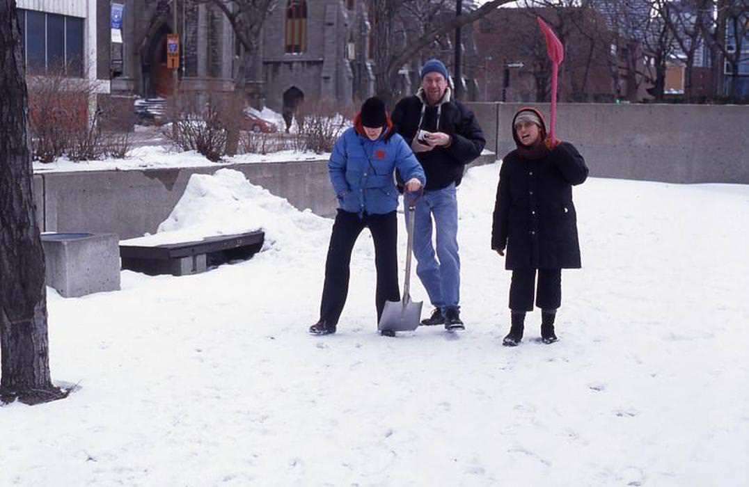 Shoveling Snow, by Yukon artists Hannah Jickling and Valerie Salez, is the second project in DARE-DARE's Dis/location: Urban Articulation Project. It follows Doug Scholes' intervention in Viger Square. Once again, the question of maintenance is addressed through an intervention sensitive to the urban "climate" of the square and its surroundings.