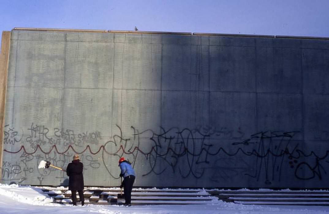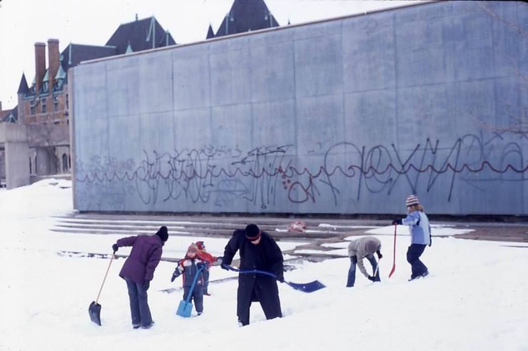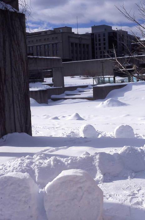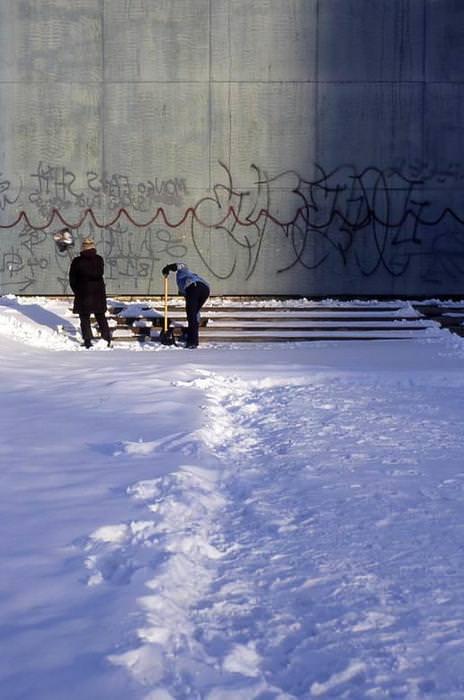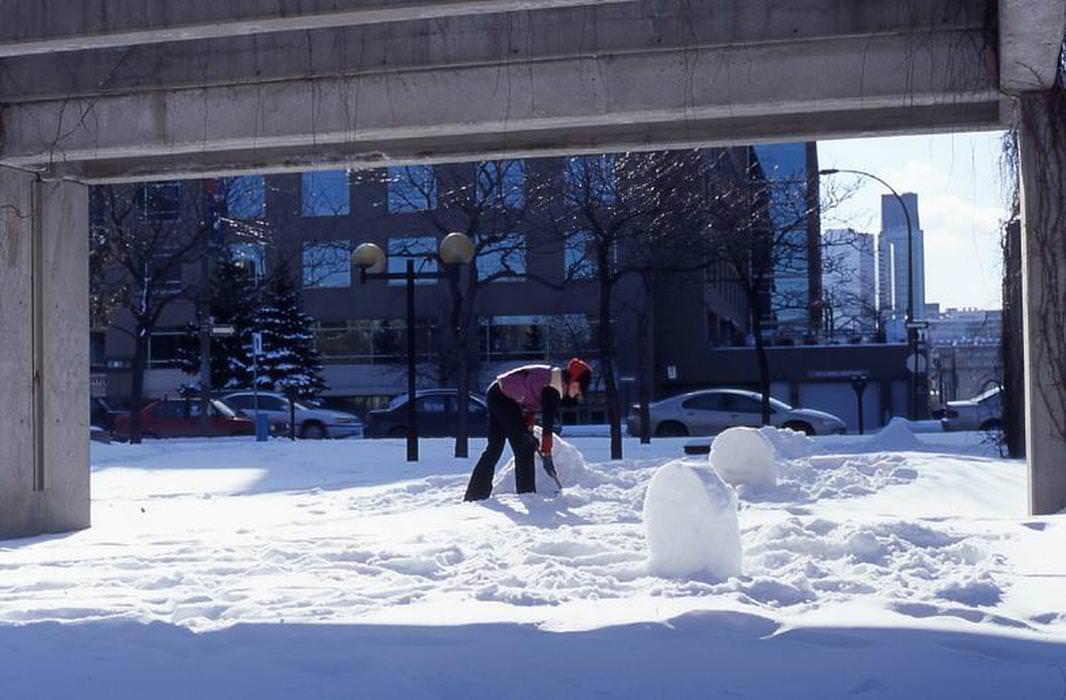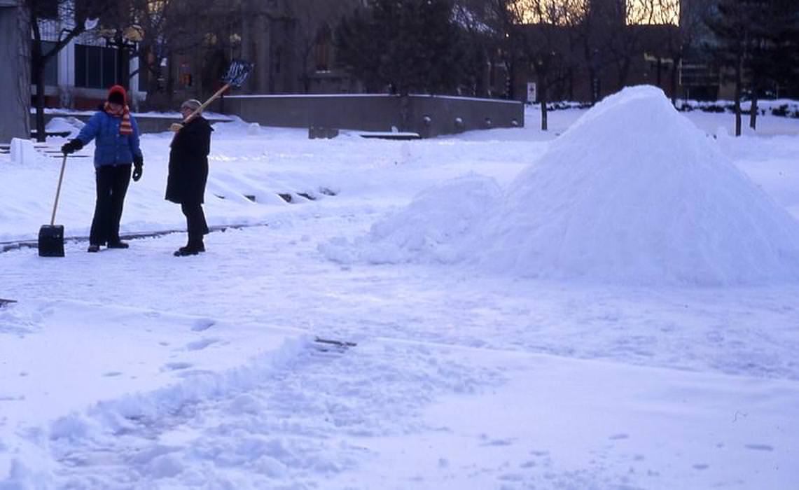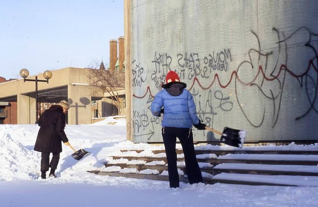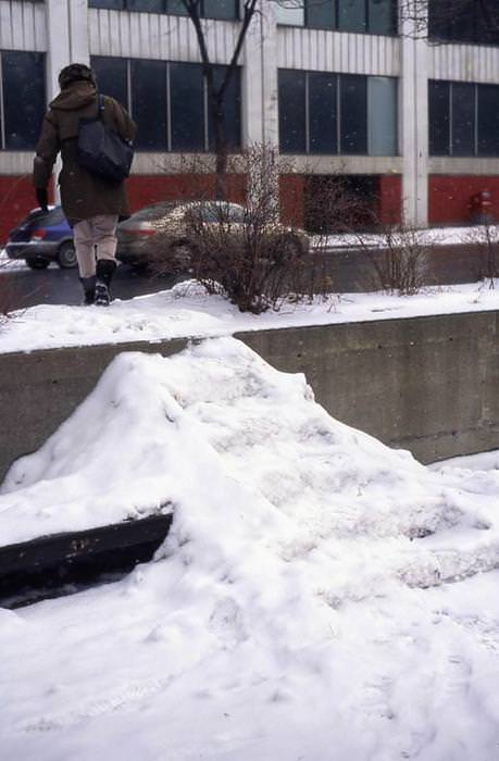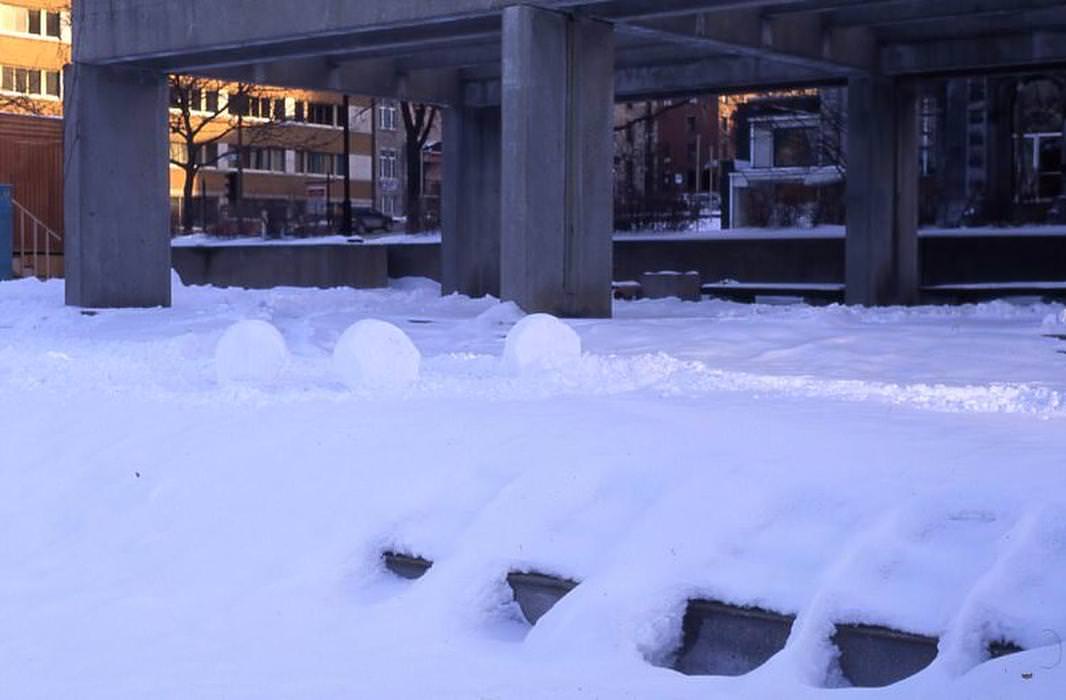 Shoveling Snow, by Yukon artists Hannah Jickling and Valerie Salez, is the second project in DARE-DARE's Dis/location: Urban Articulation Project. It follows Doug Scholes' intervention in Viger Square. Once again, the question of maintenance is addressed through an intervention sensitive to the urban "climate" of the square and its surroundings.
