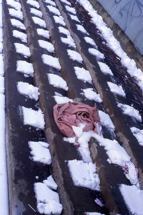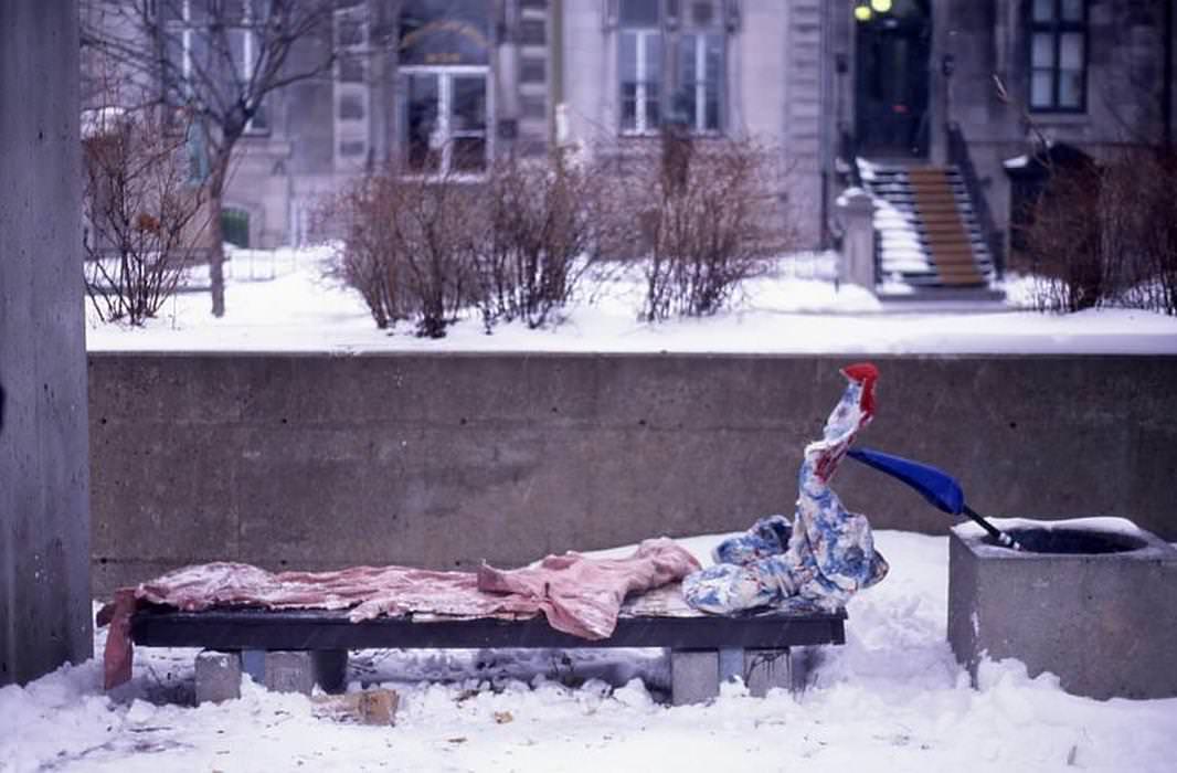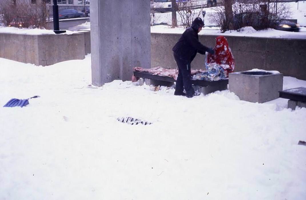 By creating obstacles to traffic, the artists make ambiguous, provocative or potentially liberating gestures, such as piles of snow "obstructing" traffic: is this a source of frustration or a pretext to engage in playful behavior? They also make gratuitous and generous gestures: a large drawing, on the vaporous snow, of delicate hems softly lit by the skyscraper's canopy. The shovels reshape park benches, give them access, make the square more inviting and comfortable. They discover, under the snow, blankets abandoned by homeless people: their colors appear strangely brilliant, all of a sudden.