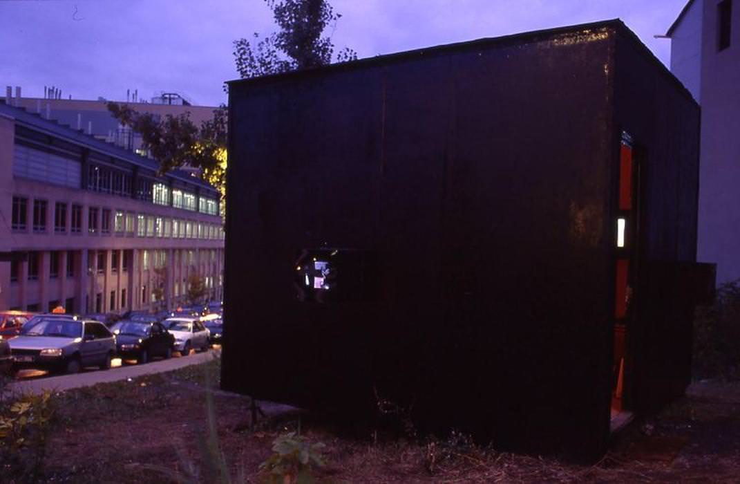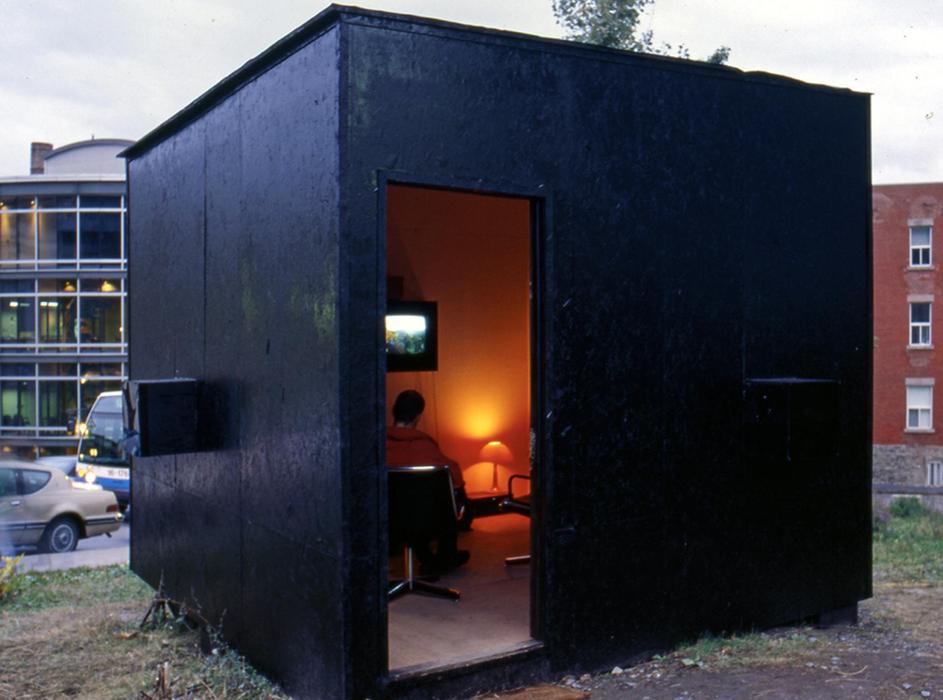 In this outdoor intervention, the room evoked by the title is a shed in a Montreal alley to which the artist had grafted video monitors.