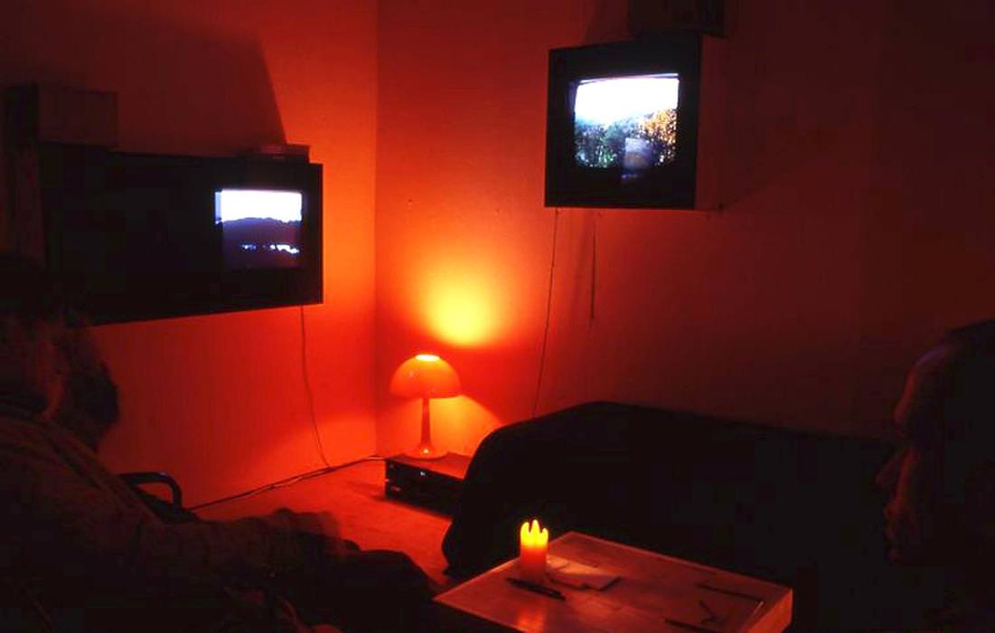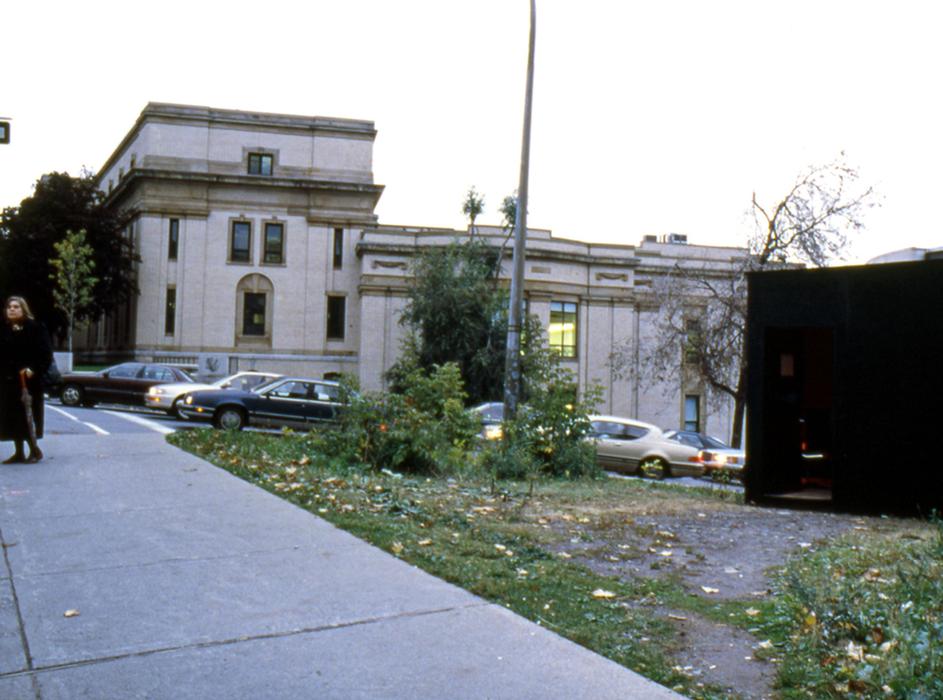 In this outdoor intervention, the room evoked by the title is a shed in a Montreal alley to which the artist had grafted video monitors. Two of them revealed images of the interior to passers-by. Upon entering, the visitor would discover other monitors, a bed and a few chairs. Three videotapes showed them images of a picturesque stretch of countryside, while a view camera offered a view of the street. The artist, who lived there for the nine days of the exhibition, was there to welcome them. It was in this hushed atmosphere that he talked for long hours with passers-by. Strangers who used to take this shortcut every day interrupted their usual route and were even led to meet each other. Jean-François Prost has a background in architecture and made this intervention in order to reveal the potential of the vacant lot as an exploratory place.