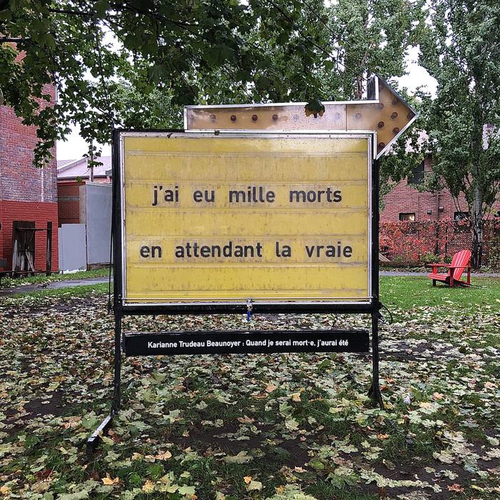 The relationship that people have with death, especially with their own, makes me wonder: does it influence the way they lead their lives? I sent a questionnaire to about fifteen creators in my circle, inviting them to reflect on the place that a certain thought of death occupies in their lives and in their artistic or writing process. I drew the twelve sentences of this residency from their answers, in order to make of the billboard sign, during my weeks of creation, a kind of false anticipatory tomb, an ante mortem inscription of the ambitions, fears or desires of twelve lives condensed, translated, in the epitaphs displayed.