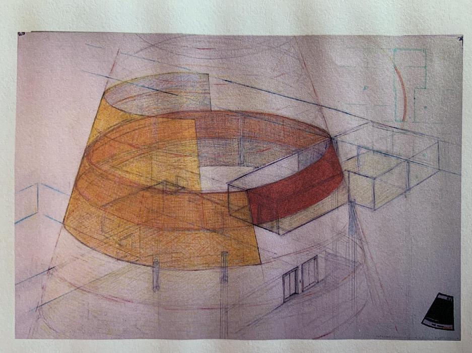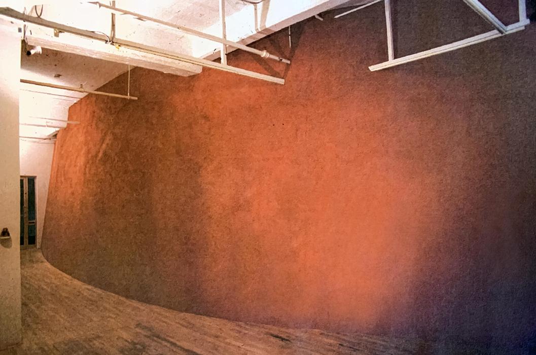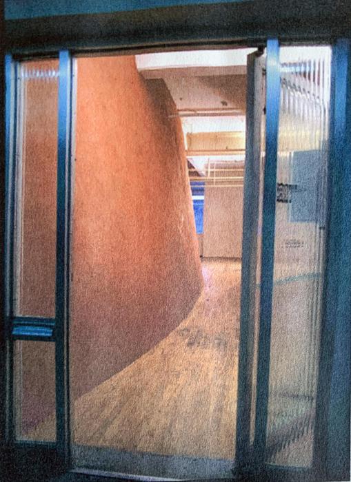 The large curved wall covered with clay that absorbs most of the available space represents the fragment of a virtual tower that would cross the gallery. Between this "intruder" wall and the gallery wall, the space shrinks for the viewer and forces him to walk along the surface, to experience the sensation of limits to which the project is attached. We find ourselves on a blurred line opposing and linking depth and surface, volume and plane, tactile and visual, void and full, continuity and rupture. By introducing in the gallery this construction with the rough texture, the artist proposes a space of "worried" representation, in a very "Carrollian" discursive spirit where the monochrome surface of the wall plays of analogy with the ring of Moebius: by skirting its surface, the outside is found in continuity with the inside... At the bend in the curve, where space takes over and allows the body and the gaze to be turned around, the viewer encounters an image executed with a stencil, giving the symbolic figure of a truncated tower surrounded by an ellipse. Between the cut tower and the truncated tower, between the monochrome panel and the linear line, all fictions are allowed and all inversions too.
