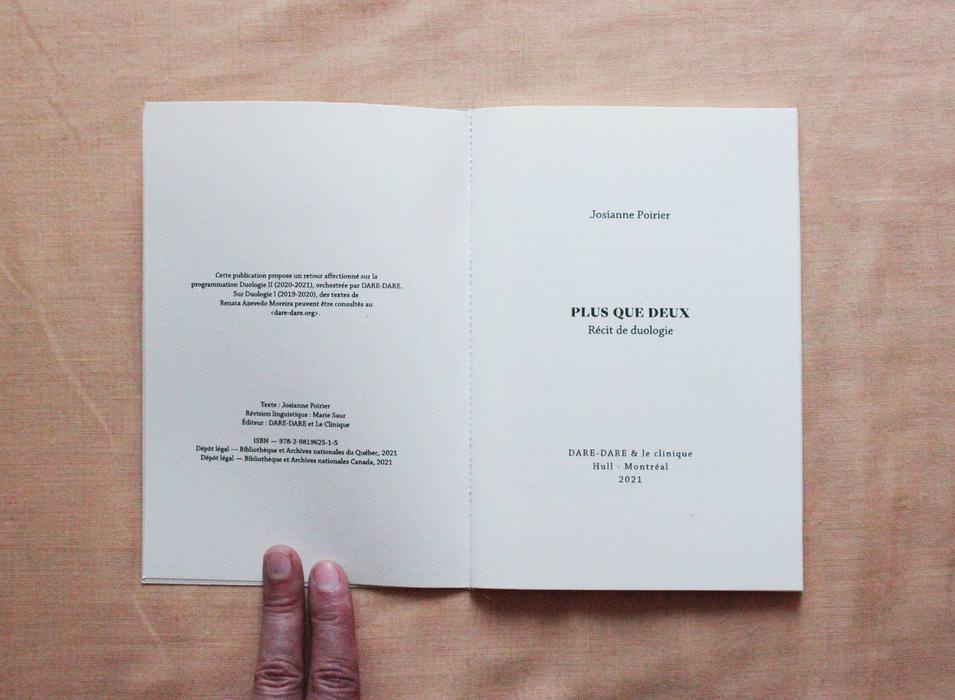 Pour conclure sa résidence de recherche d'un an, l'autrice Josianne Poirier a fabriqué le fanzine Plus que deux. Tiré à 100 exemplaires, il propose un retour affectionné sur la programmation Duologie II (2020-2021), orchestrée par DARE-DARE.