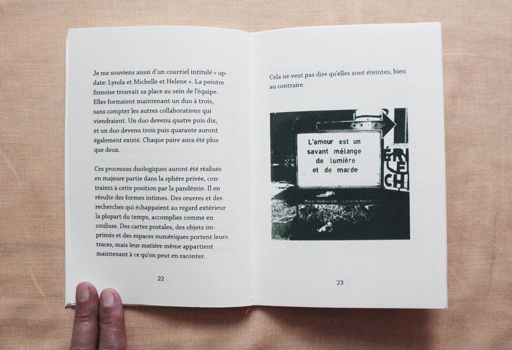 Ces processus duologiques auront été réalisés en majeure partie dans la sphère privée, contraints à cette position par la pandémie. Il en résulte des formes intimes. Des œuvres et des recherches qui échappaient au regard extérieur la plupart du temps, accomplies comme en coulisse. Des cartes postales, des objets imprimés et des espaces numériques portent leurs traces, mais leur matière même appartient maintenant à ce qu’on peut en raconter. Cela ne veut pas dire qu’elles sont éteintes, bien au contraire.
