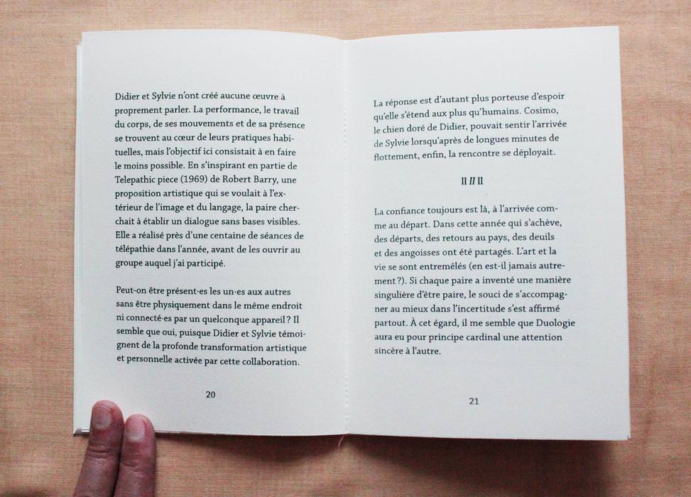 La confiance toujours est là, à l’arrivée comme au départ. Dans cette année qui s’achève, des départs, des retours au pays, des deuils et des angoisses ont été partagés. L’art et la vie se sont entremêlés (en est-il jamais autrement ?). Si chaque paire a inventé une manière singulière d’être paire, le souci de s’accompagner au mieux dans l’incertitude s’est affirmé partout. À cet égard, il me semble que Duologie aura eu pour principe cardinal une attention sincère à l’autre.