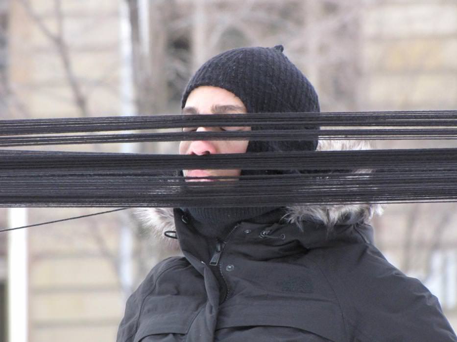 Le temps des « bêtes féroces de l’espoir » – formulation empruntée au poète Gaston Miron – était le thème retenu par le comité de programmation pour l’appel de dossiers 2013, qui invitait les projets à renouveler l’expérience collective de la ville et à s’affranchir des notions du temps. Le temps, mais aussi son sens sont des éléments constitutifs de la pratique performative de Viale, qui à travers l’« action-processus » s’intéresse à la corporéité de l’espace et de la durée[i]. Pour son projet chez DARE-DARE, l’artiste a déconstruit le mode de présentation habituel d’un projet d’un mois en quatre semaines séparées, soit une par saison. Avec Ma Intervalle (actions infiltrantes), Viale a donc investi sept lieux différents dans le Quartier des spectacles pour chaque jour de la semaine, et ce pour les quatre saisons. En performant souvent au-delà de deux heures ou même de manière plus ponctuelle, l’artiste désirait explorer le temps long et aliénant dans l’espace public, en privilégiant une approche basée sur la persistance. À l’aide de différents objets, tels que de la laine, un foulard, du papier et du sucre notamment, Viale effectuait une série d’actions posées et imagées parfois discrètes et subtiles, mais jamais invisibles, où le corps agissait comme constante. Sur le chemin de la Reine de l’Esplanade de la Place des Arts par exemple, l’artiste a crayonné l’espace-intervalle entre chaque dalle avec une craie lors de la première saison, soit en été, en réinvestissant différemment ce lieu à l’automne, à l’hiver et au printemps.