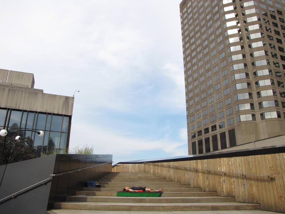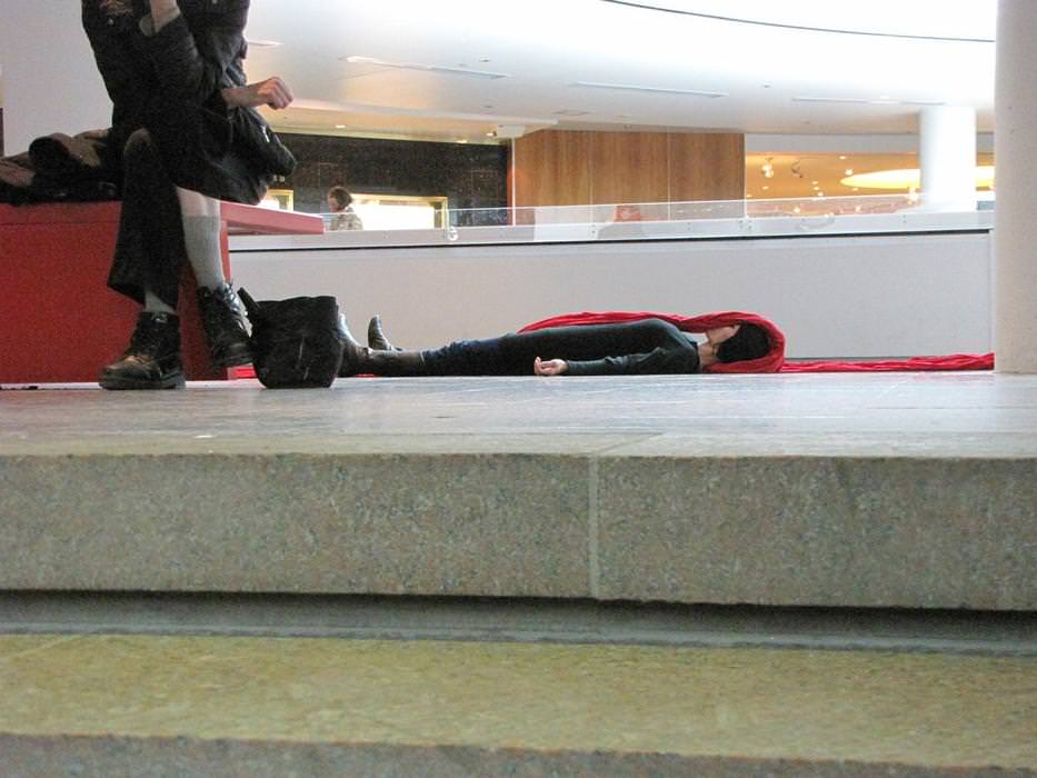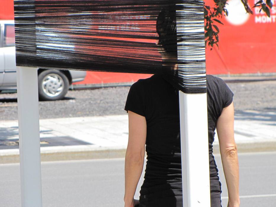 Les sept lieux investis à chaque saison par l’artiste ont donc été déterminés en fonction de leur situation périphérique, mais aussi pour leur linéarité architecturale. Viale désirait ainsi donner un sens à ces espaces délaissés, qui constituent pour la plupart des lieux de passage (escaliers, bancs, abribus)[iv]. Ces interstices urbains génériques constituent les exemples du « non-lieu » contemporain, selon Marc Augé, anonyme et anhistorique[v]. Dans Ma Intervalle (actions infiltrantes), les lieux transitoires investis par l’artiste sont devenus au cours des saisons porteurs d’une histoire, d’un souvenir. En infiltrant autant l’intérieur que l’extérieur du Quartier des spectacles, Viale s’est réappropriée des parcelles de l’espace urbain, en forçant le spectateur – accidentel ou averti – à s’arrêter pour un moment.
