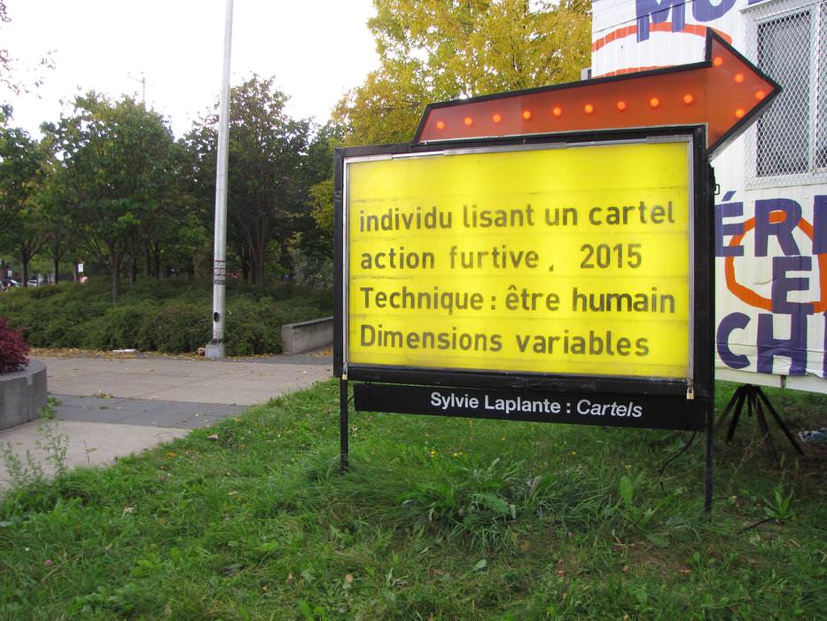 En général, dans les musées et galeries, le cartel est apposé sur le mur à côté de l'œuvre ou parfois sur l'encadrement d'une peinture. Mais sur le tertre du métro Saint-Laurent, il fait partie de l'œuvre. Dans certaines peintures anciennes, le cartellino est une représentation peinte par l'artiste dans son tableau, d'un feuillet de texte descriptif avec date et signature, un cartel intégré qui commente, ajoute et transforme comme une didascalie dans une œuvre dramaturgique.