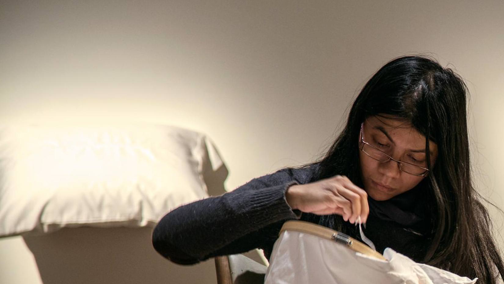 The textile works that Estela is showing at Artista x Artista are the culmination of a process that has started during her evolutive performance Hantises (Asechantes), which was presented as part of her exhbit Susurrantes (Centre culturel de Notre-Dame-de-Grâce, Montréal, 2017). During this performance, whilst she was embroidering by hand with white thread on second-hand domestic objects made of fabric, the artist engaged in conversations with the public on fears and anguish that can arise at work, derived from the imperatives of productivity. The embroideries were sentences that visitors had voiced already, naming and expressing emotions they had felt. These words were generously and genuinely offered to Estela López by the people who talked with her, making it the primary media for future works. Thus, the assembled textual material gave way to many works in series, among which the embroideries presented here. Interested in combining her textile work with architectural spaces and the furniture that inhabits these spaces, López contributes to the exhibit with a series of installations and a intervention on a wall.