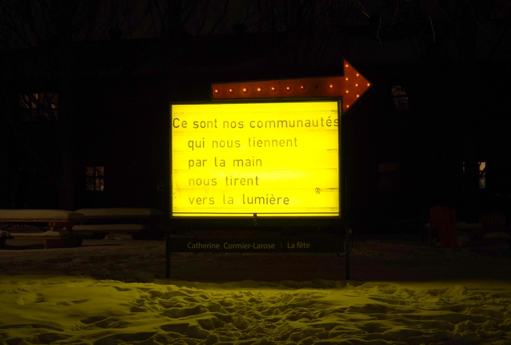 To mark our fortieth anniversary, the celebrations committee invited Catherine Cormier-Larose as one greets an essential voice—with gratitude and joy. A poet, critic, curator, and tireless connector, she embodies a lasting commitment to the poetry community: a vibrant, inspiring presence that brings people together. Titled LA FÊTE, the corpus presented in the illuminated sign sidesteps any notion of decoration or surface-level celebration. Here, the party is a collective gesture, a political stance, a form of joyful resistance. Short, incisive poems turn dancing into an act of disobedience, public conversation into a patient revolt, and artistic provocation into an open invitation. LA FÊTE insists that creating and gathering are, in themselves, acts of resistance—and reasons to sparkle together.