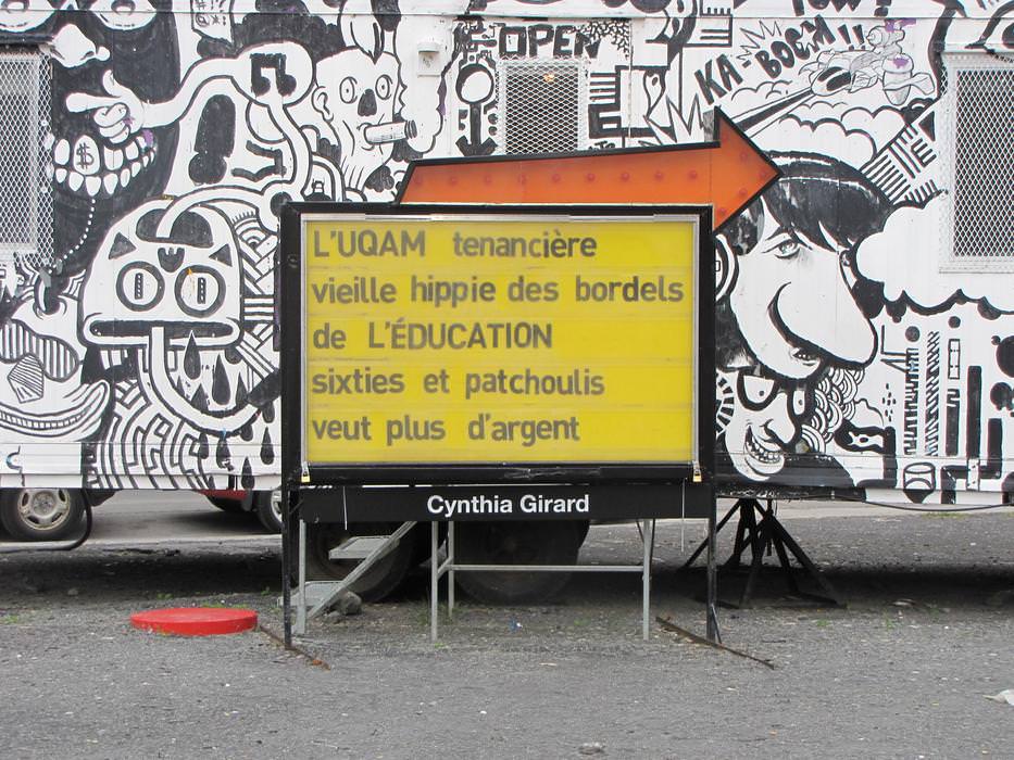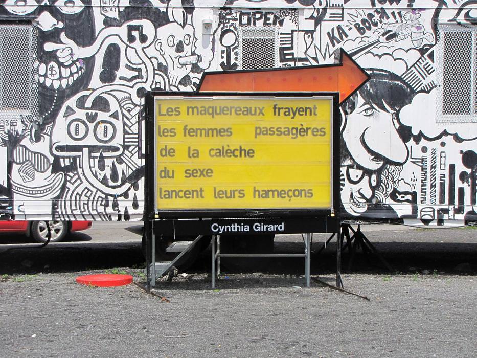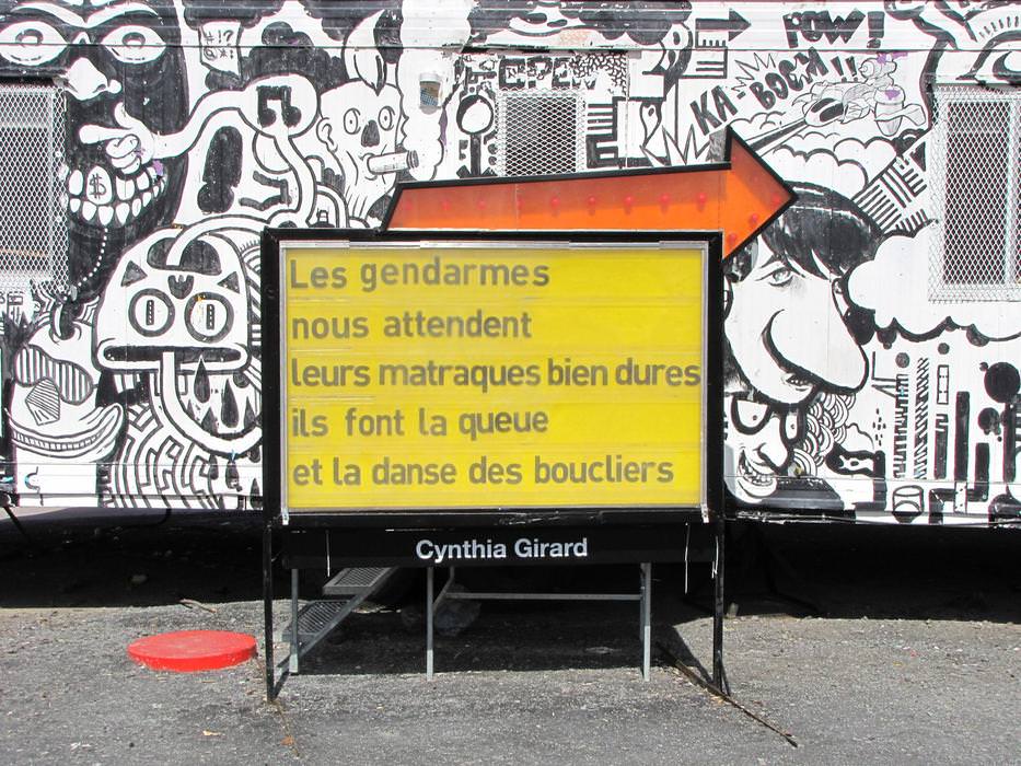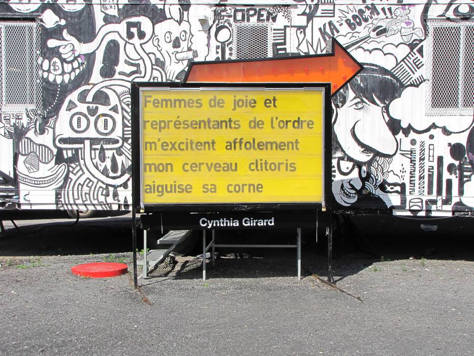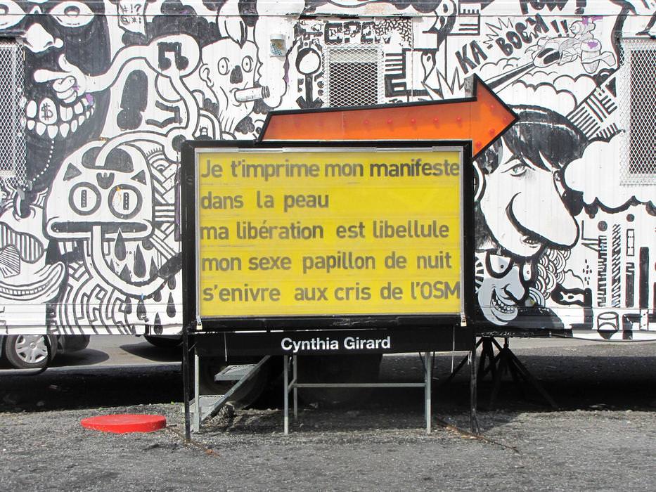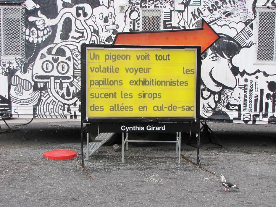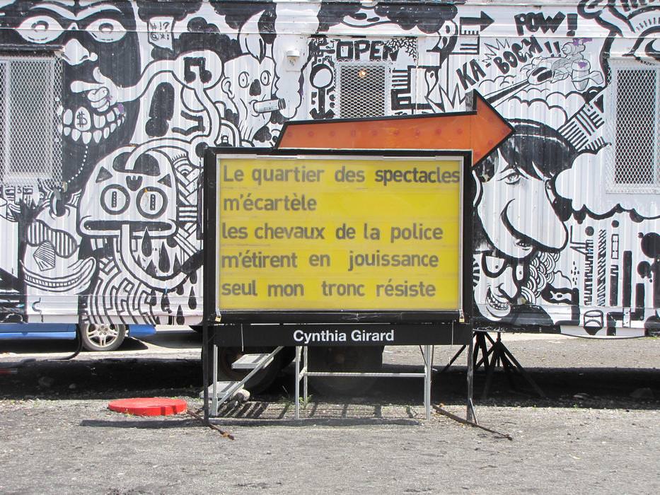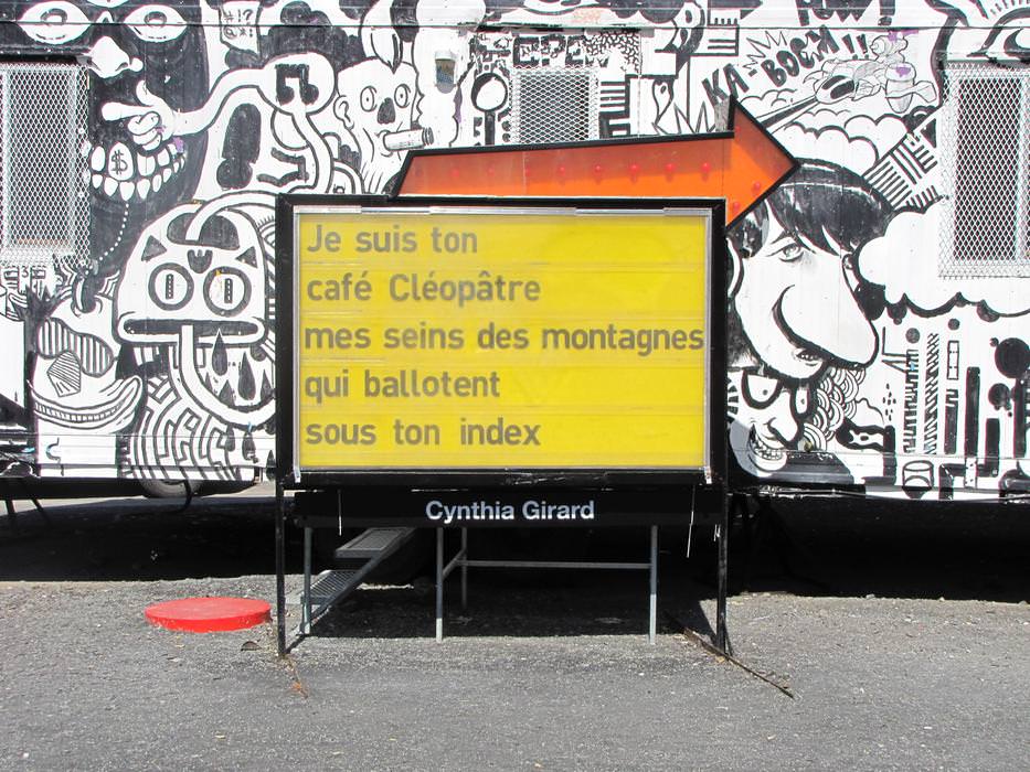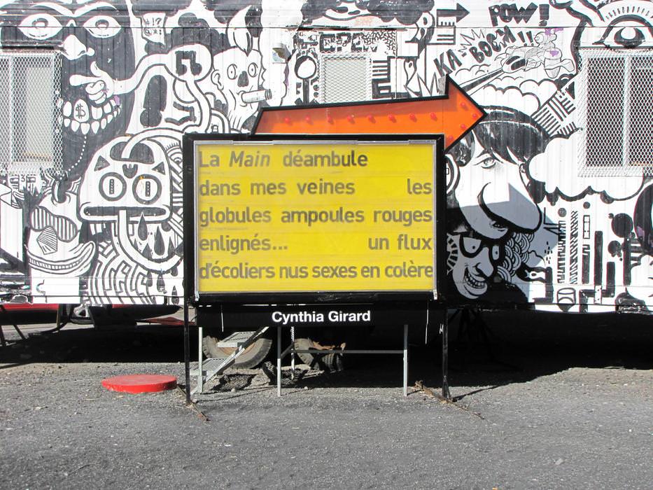 After reflecting upon the interventional space where the sign is located, the strongest references to appear were the Red Light district, the student crisis', and the Quartier des Spectacles. Each of the nine poems were written bearing all of these considerations in mind.