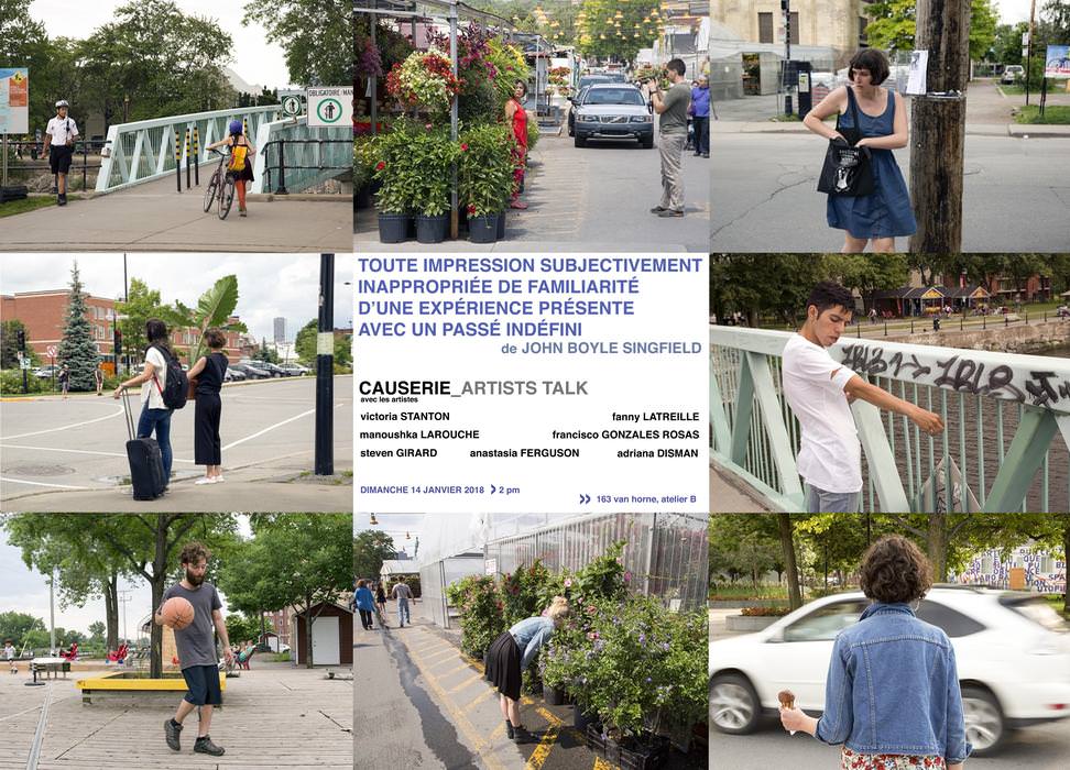 Last July, with the complicity of 8 performance artists, John Boyle-Singfield realized the collection of public interventions Toute impression subjectivement inappropriée de familiarité d’une expérience présente avec un passé indéfini within Saint-Henri area.