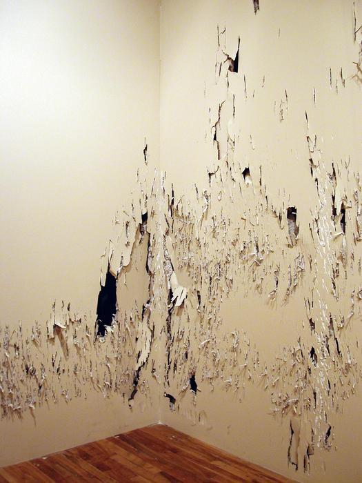 At the heart of Denise Hawrysio's approach lies a philosophical questioning of the concepts of transformation, art aesthetics and formal boundaries. There are also preoccupations with identity and the creative act. In his site-specific installations, the surface is used as an element to disrupt the relationship between image and viewer. This enables him to engage in a dialogue with the "scenic" and compartmentalized spaces of the gallery. At the same time, his work deals with the irremediably complex psychological tensions associated with artistic creation, and subjects such as reason and madness, trauma and revelation.