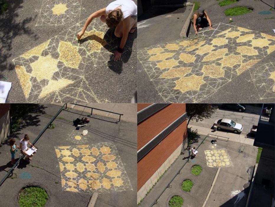 From traditional and geometric design, with what she can get her hands on from the chosen site (a garbage lid for drawing circles, a string to guide her marks, etc.) Iona constructs different colored mosaics all the while interacting with residents of Habitations de Mentana.