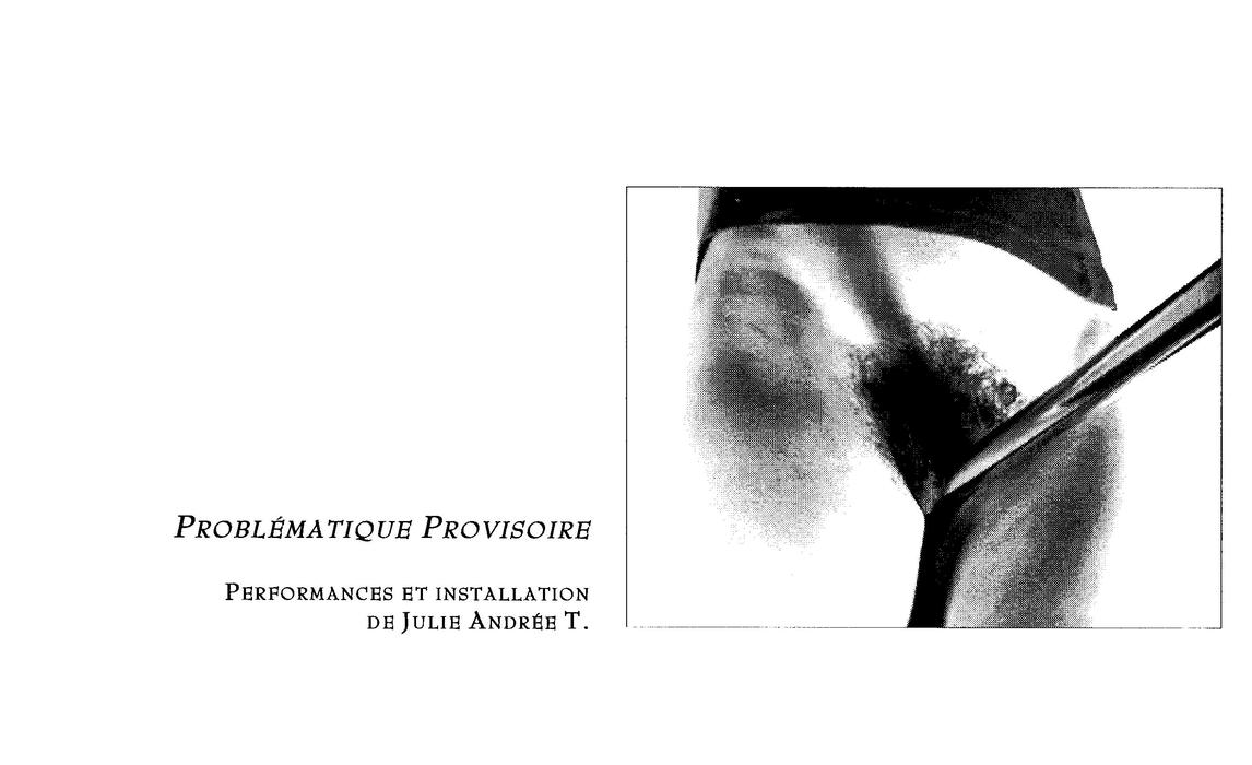 A graduate in visual arts from Concordia University, Julie Andrée T. is active in installation and performance art, placing the body and space at the heart of her research. She has presented her performances in Europe and Canada. She has had solo exhibitions at Le Lieu (Quebec City), A Space (Toronto), Articule (Montreal) and most recently at Trace Gallery (Cardiff). Since 1999, she has collaborated with PME and Jacob Wren (experimental theater), choreographers Xavier Le Roi, Dominique Porte and Benoît Lachambre.