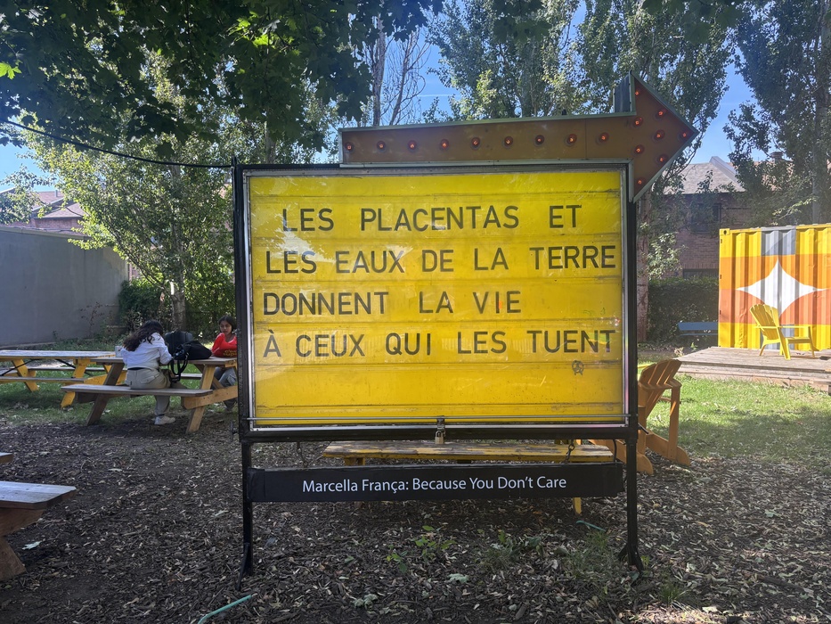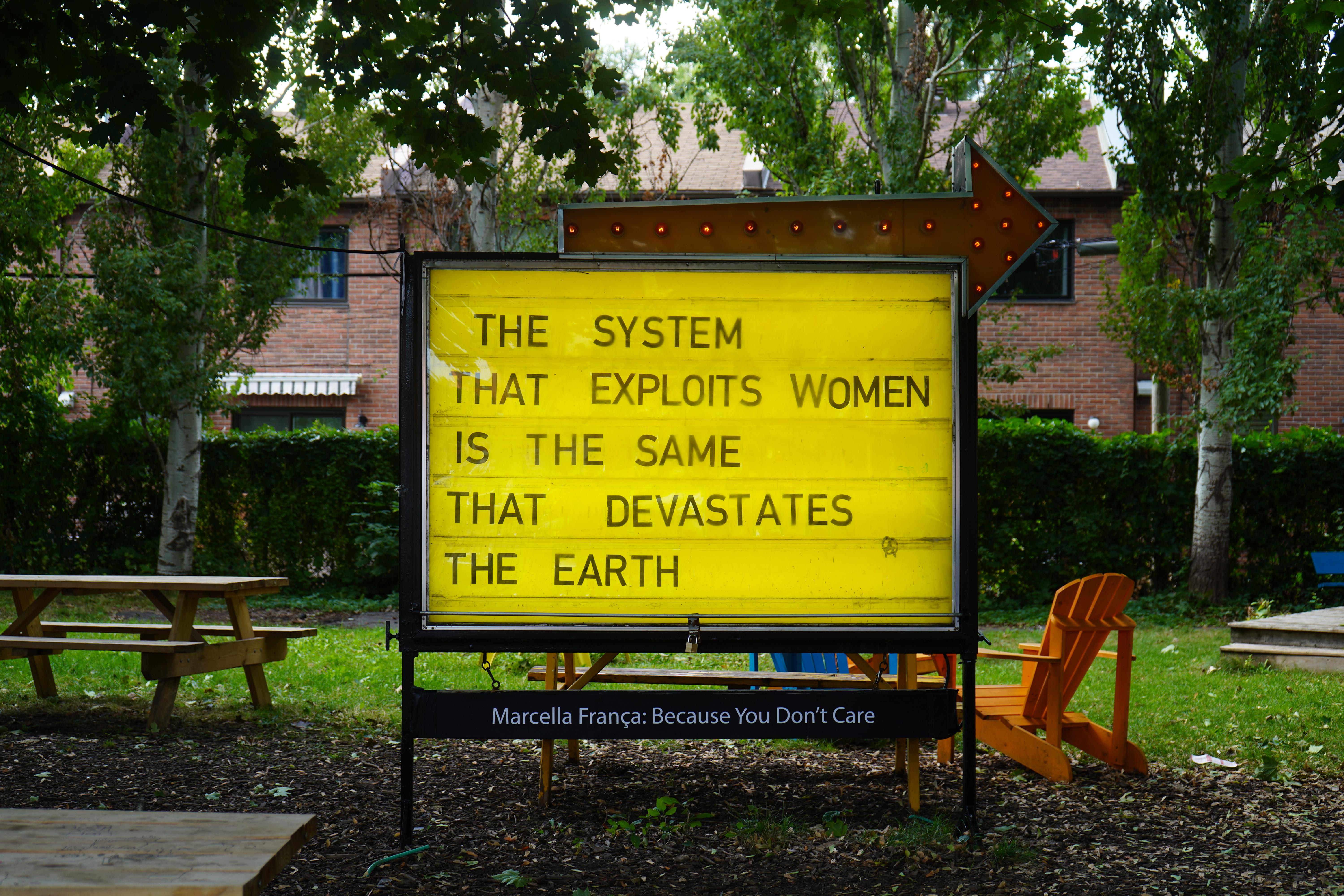 The BECAUSE YOU DON'T CARE project proposes the installation of 12 phrases—6 in French and 6 in English—in the urban space of southwest Montreal, an area marked by its bilingualism and social diversity. These statements aim to challenge passersby on the deep connections between colonial extractivism, the climate crisis, and systemic misogyny.
