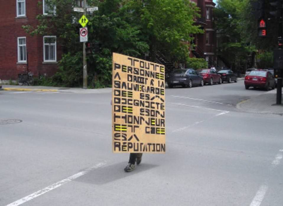 karen elaine spencer propose de disséminer dans l’espace public des extraits de la Charte des droits et libertés du Québec, qu’elle a retranscrits sur de grands panneaux de bois. En invitant des groupes de participant.e.s choisis à sélectionner des passages de la Charte qui résonnent particulièrement pour eux/elles, l’artiste s’approprie ensuite ces extraits afin de réaliser des écriteaux aux formats imposants, dont elle fera ensuite don à l’équipe de participant.e.s.