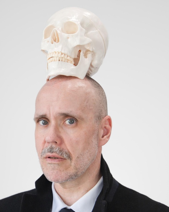 Steve Giasson. Invisible Performance No. 294 (Watching a Disaster (in Slow Motion)). After Andy Warhol. Self-Portrait with Skull. 1977. Performers: Steve Giasson and Martin Vinette. Photography credit: Martin Vinette. Photo retouching: Charles-Étienne Lebrun. Galerie B-312. August 2, 2025. -