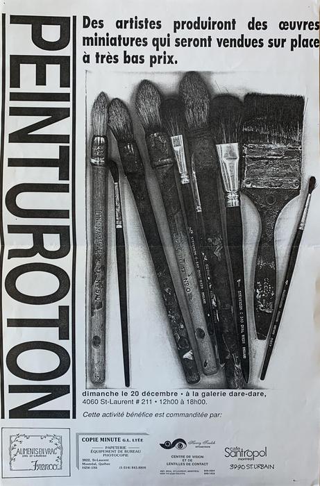 The DARE-DARE collective invites the whole population to a benefit activity: a painturoton. During this day, artists will produce miniature works that will be sold on site at very low prices. This event will be used to raise funds to start the year 1988.