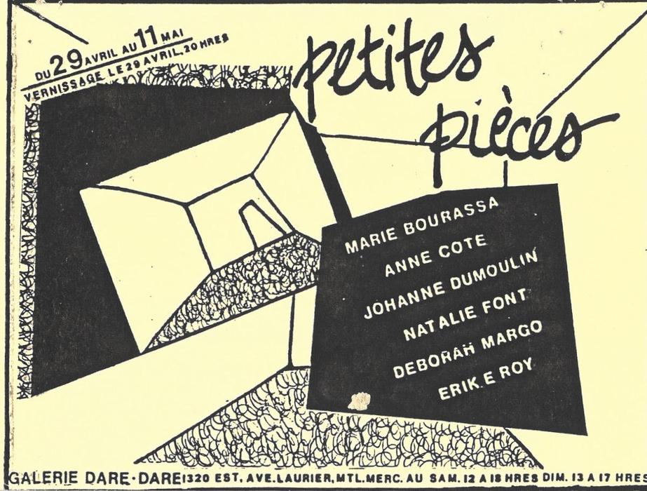 DARE-DARE presents six artists who had previously exhibited in the former location in 1985: Marie Bourassa's ceramics, Anne Côté's icons, Nathalie Font's prints, Deborah Margo's and Johanne Dumoulin's drawings, and Erik E. Roy's photographs.