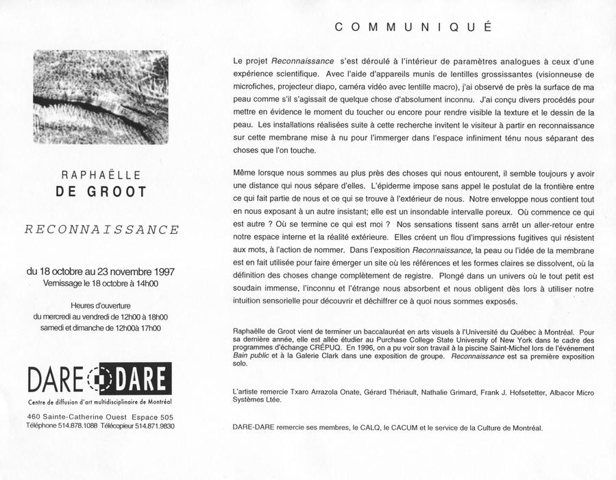 Raphaëlle de Groot completed her Bachelor of Fine Arts degree at the Université du Québec à Montréal. For her last year, she went to study at Purchase College State University of New York as part of the CRÉPUQ exchange program. In 1996, her work was shown at the Saint-Michel pool during the Bain public event and at the Clark Gallery in a group show. Reconnaissance is his first solo exhibition.