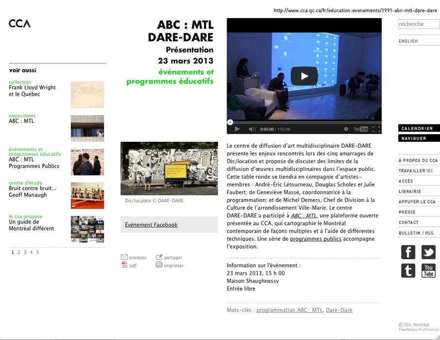 Within the ABC : MTL exhibition's public program at the Canadien Centre for Architecture, DARE-DARE introduces the issues encountered during the five first iterations of the Dis/location project, accompanied by artists, members of the collective and a city representative. André-Éric Létourneau, Douglas Scholes and Julie Faubert will talk about their projects as artists and members, Geneviève Massé will present the last 10 years of the Dislocation project and Michel Demers, Cultural Chief of Ville-Marie District will tell us what is it like to follow a center like DARE-DARE, that proposes projects in a variety of public spaces.