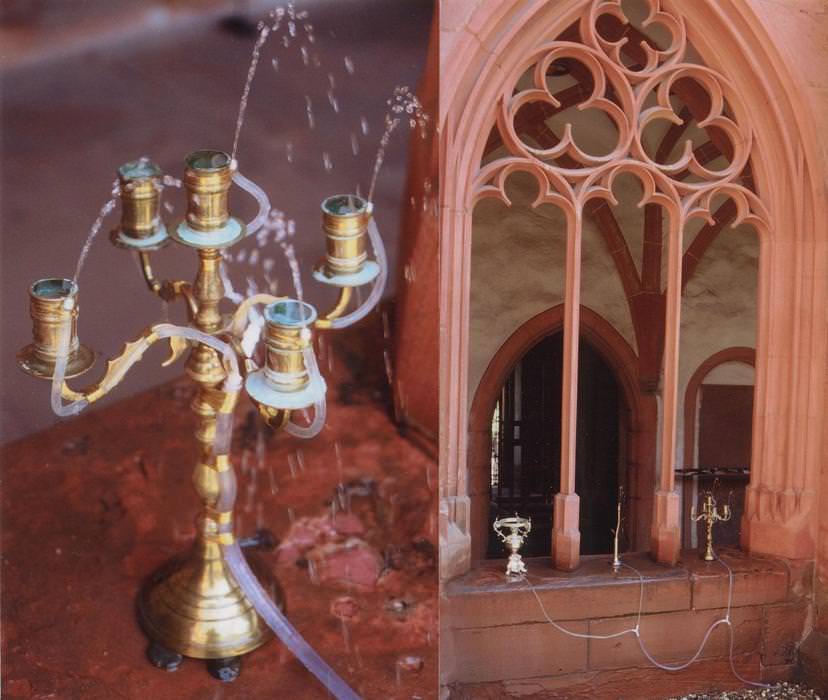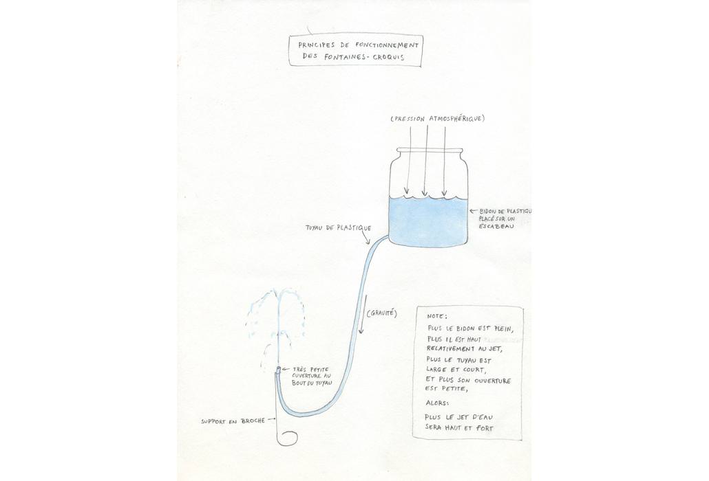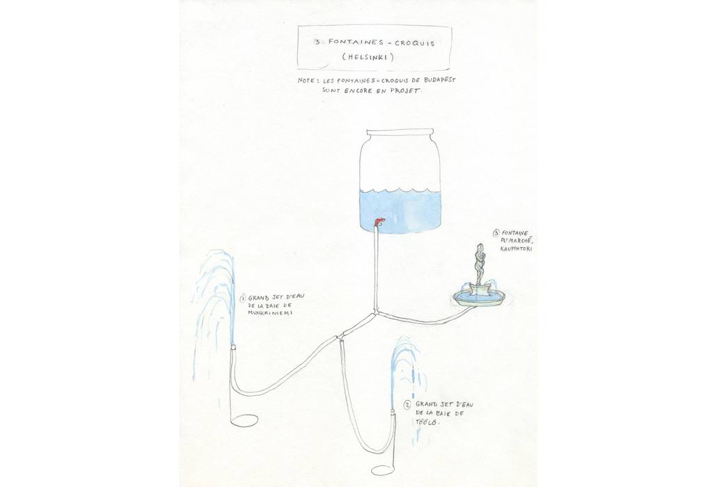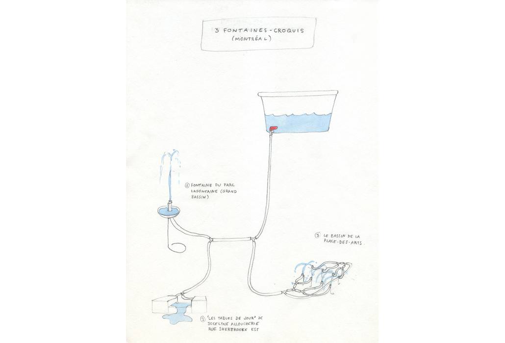 The travel sketch plays an important role for the artist. In Montreal, Sally Lee Sheeks made sketches of three fountains: the large fountain in the Lafontaine Park basin, Jocelyne Alloucherie's fountain sculpture Tables de jours, and the fountain basin in Place des Arts. Using plumbing and domestic materials, the artist has designed small (20 to 50 centimeters high) and functional models of the fountains that she will present in a public place. A series of public visits (in collaboration with Amélie Brault) is organized to describe the real fountains through stories, urban legends and allegories. The project will later be presented in Helsinki and Budapest.