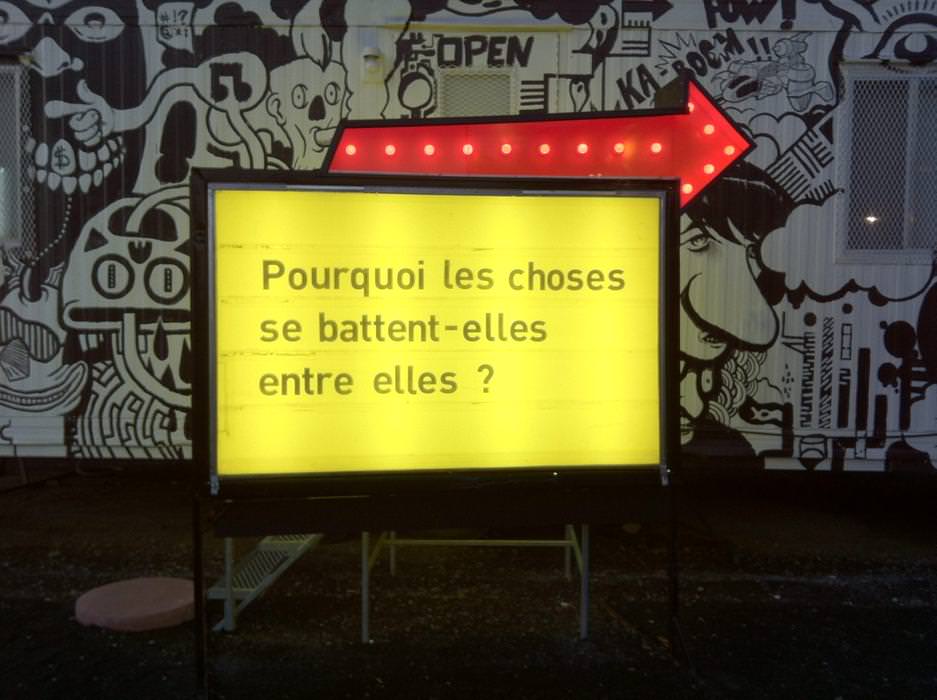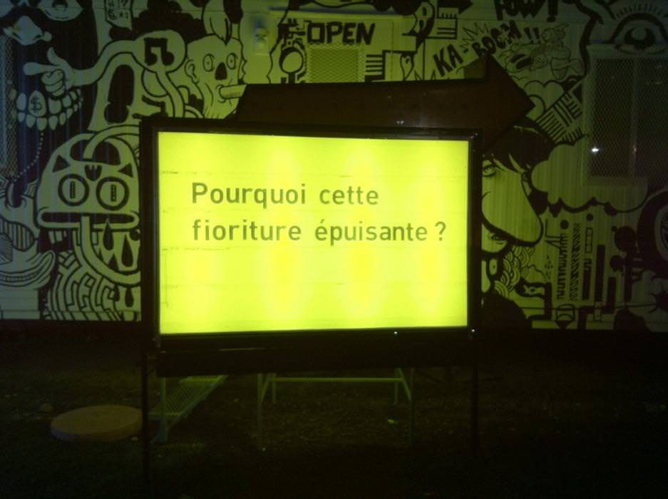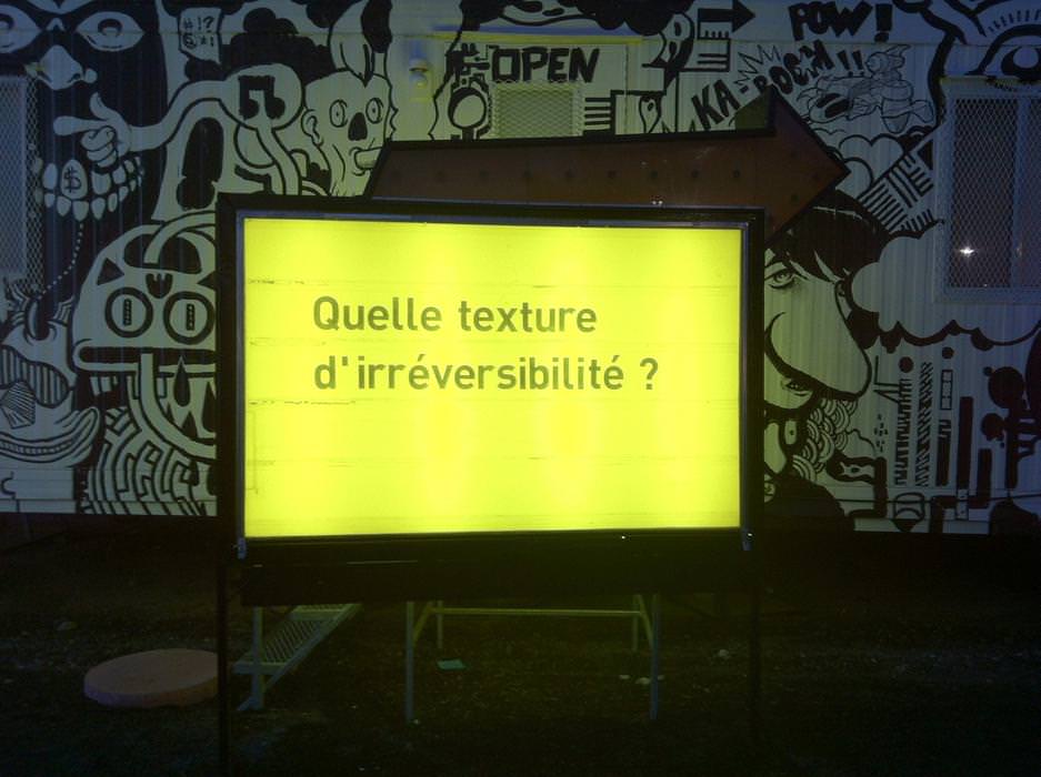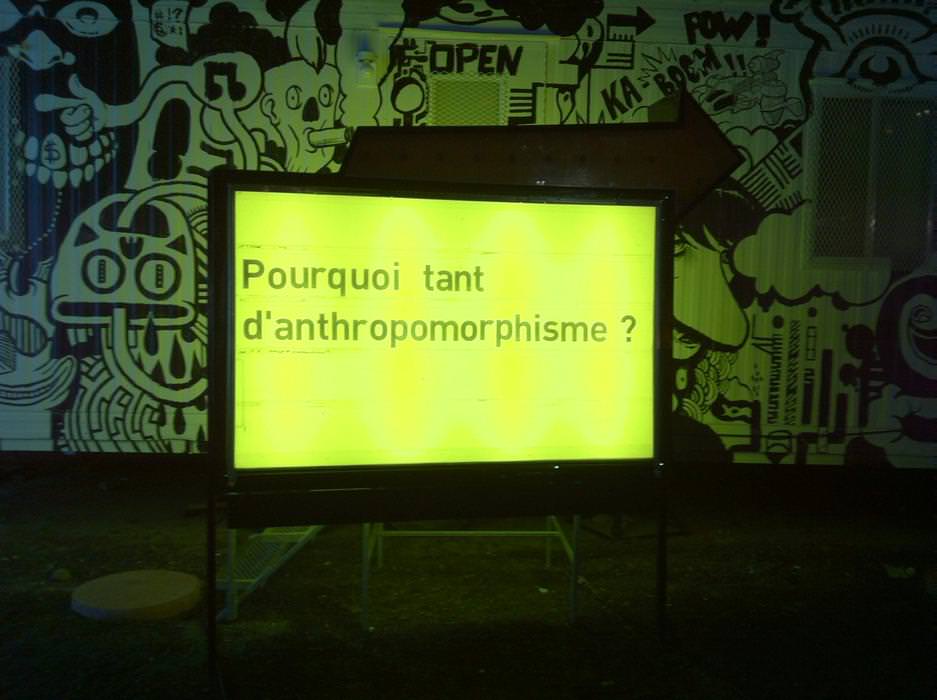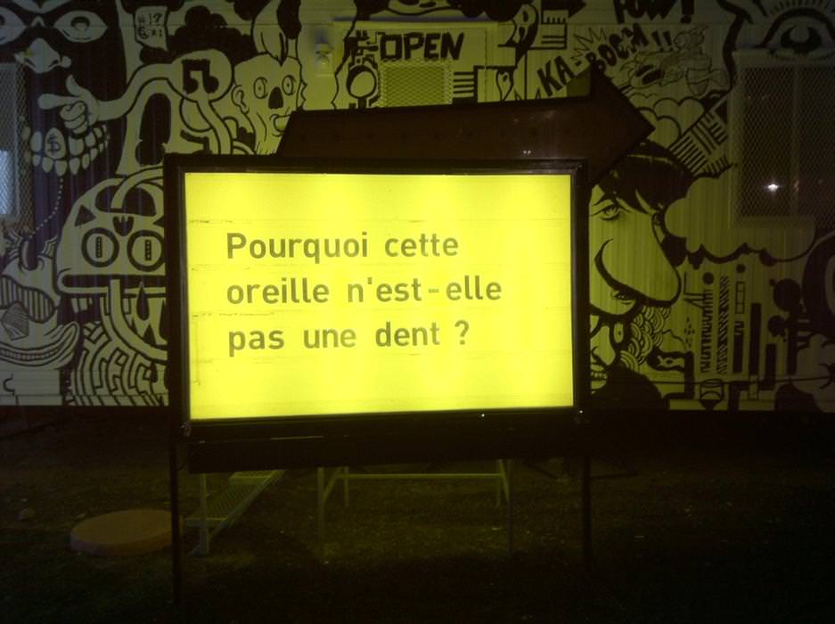 I decided to answer it not by an actual answer, but by asking other questions, questions that were asked during a few months of walks in the forest near my place of residence. Very early on in this process, the idea came to me that these questions, posed in a rural context without interlocutors or reception, could be presented in a context diametrically opposed to it, an urban context of incessant reception.