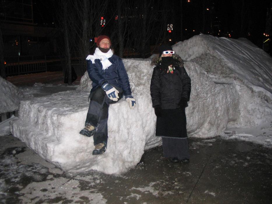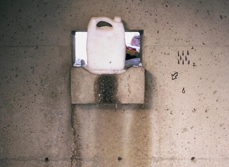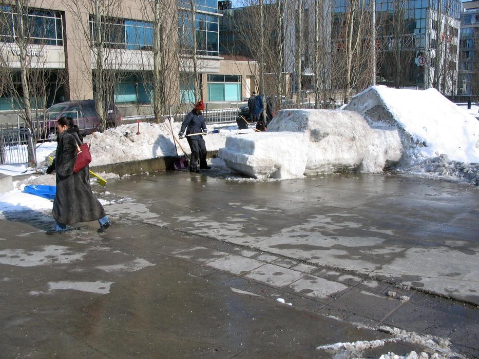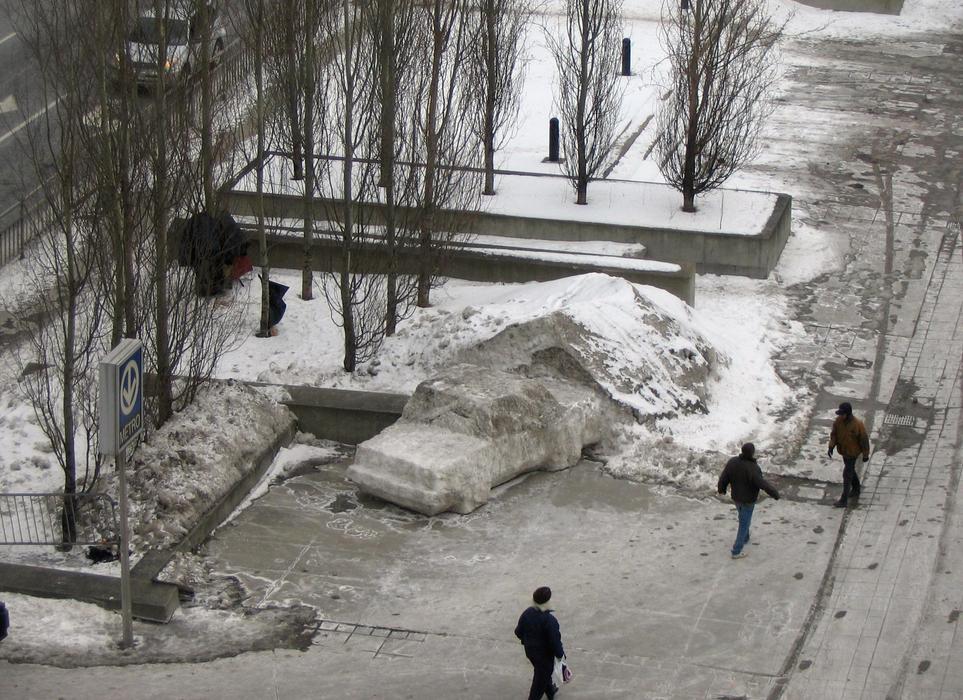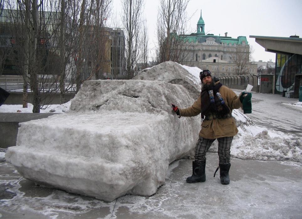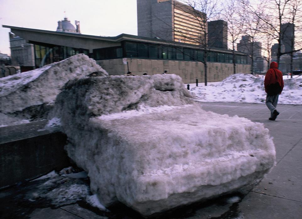 Project: Char brun. Medium: dirty snow. The exhibition presented at DARE-DARE is the result of a project realized in Quebec City in February 2004. Inspired by an outdoor parking lot in the Lower Town, Stéphanie Pelletier decided to intervene there. A mound of dirty snow occupied a parking space and offered itself as exploitable material. In one night, with the help of a friend, she carved a car from this pile. Given the quality of the snow, the model chosen was that of the "char brun" (square-like and old car). The altered state of matter emphasized one of the consequences of the use of the automobile and immediately returned the brown car to its context. By the ambient situation around it, this context acted as an alternative to the proposal, because the brown car was "browning" day by day.