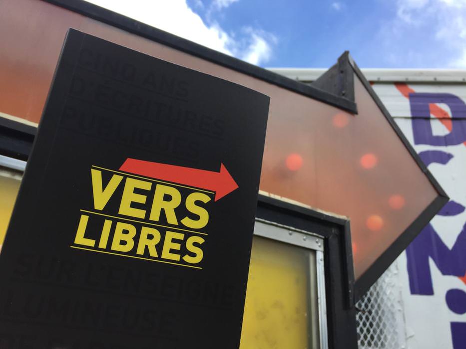 After the displacement of its headquarters near the Saint-Laurent metro station in 2012, DARE-DARE began broadcasting public writings on a luminous sign near its mobile trailer. For five years, twenty-nine artists have been inspired by the socio-environmental context to offer aphorisms, poems and sentences that take the short form of slogan, haiku or tweet. This collection presents five thematic annual programs: spectacle, time, fear, infiltration and meeting society. These texts took place in two very distinct places: the Quartier des spectacles and Sud-Ouest (St-Henri).