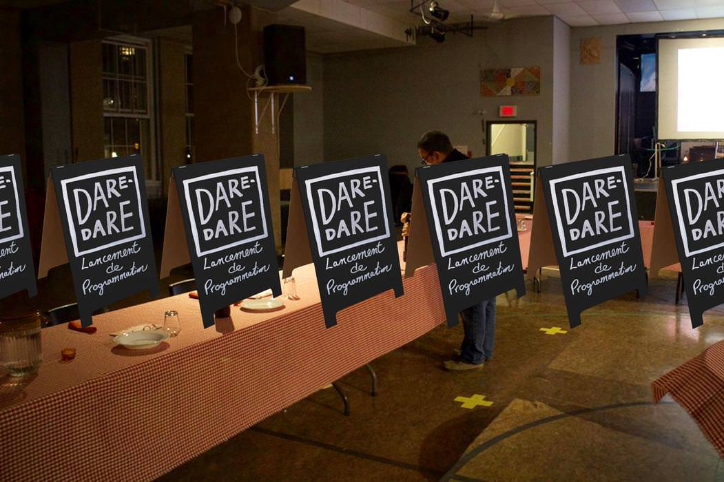 L’événement est festif : en annonçant officiellement le contenu artistique de la nouvelle année de diffusion du centre, nous célébrons l’énergie innovante, la joyeuse et audacieuse détermination des artistes qui poursuivent leurs recherches et interventions dans l’espace public, et aussi, la mission, toujours renouvelée de DARE-DARE, de les accompagner dans leurs productions.