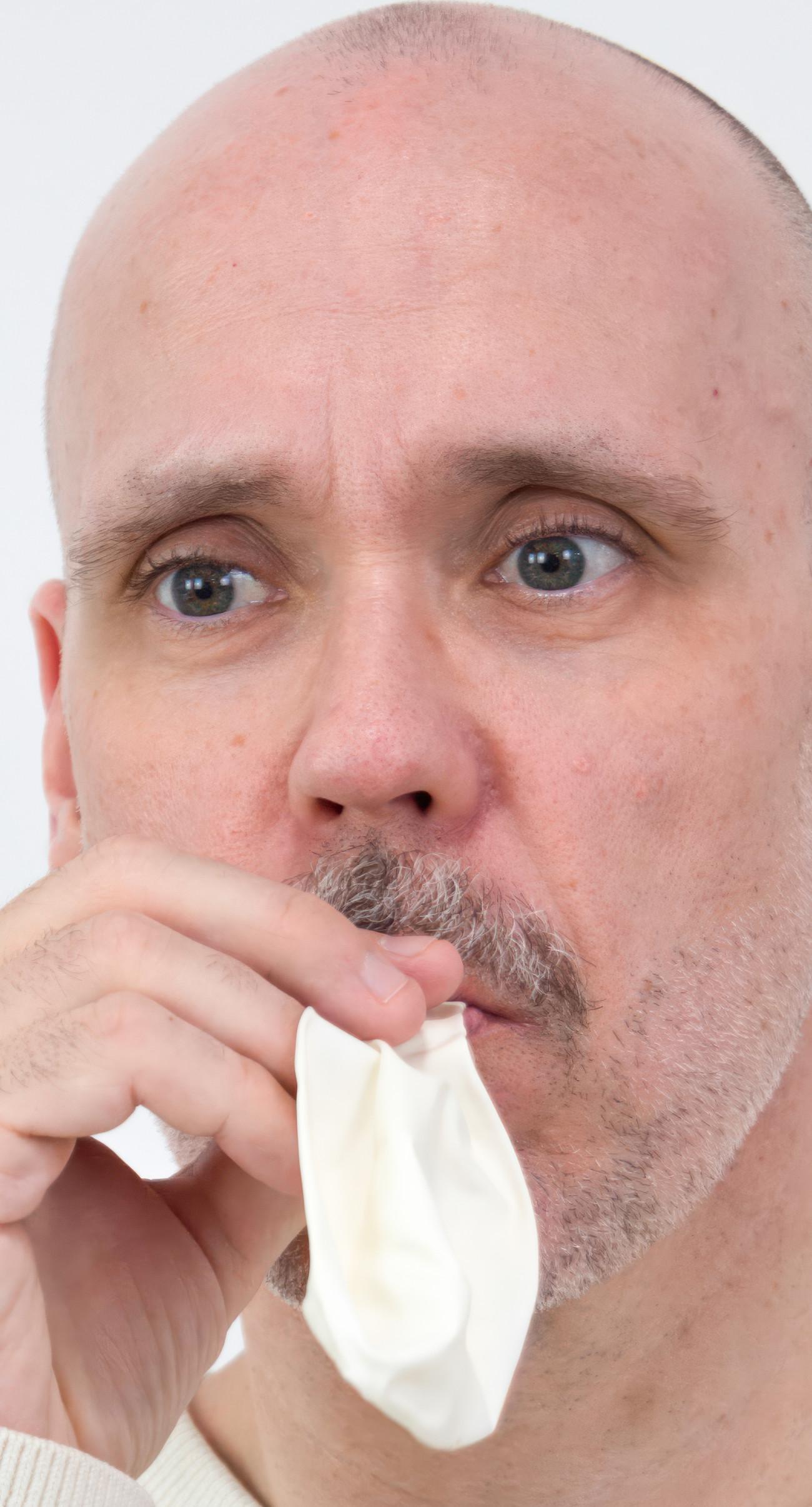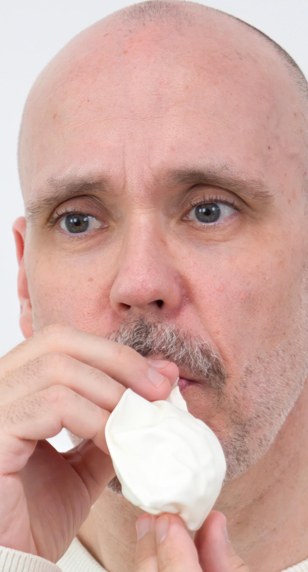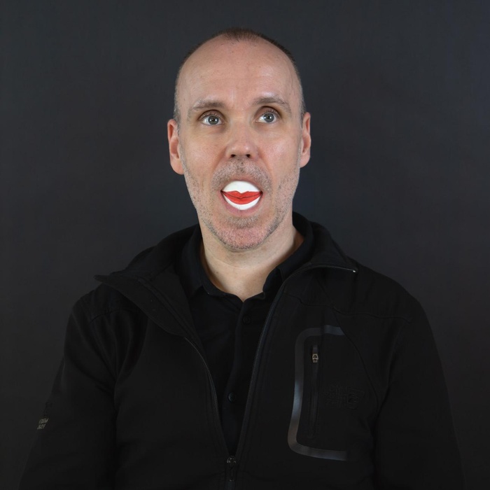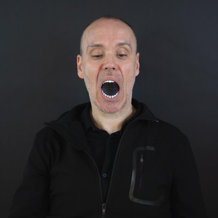 Steve Giasson. Performance Invisible núm. 265 (Contener la lengua). Reenactment de Jannis Kounellis. Porta Murata. 1990. Performista: Steve Giasson. Crédito fotográfico: Martin Vinette. Retoque fotográfico: Charles-Étienne Lebrun. Centre des arts actuels SKOL. 17 de agosto de 2024. -