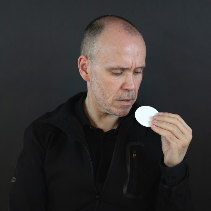 Steve Giasson. Performance invisible n.º 279 (Intentar hacer otra cosa). Según Reiner Ruthenbeck. Taschenspiegel. Baldosa de cerámica (objeto encontrado), 10.8 x 10.8 cm, aprox. 20 copias, firmadas y fechadas, 1970–1971. Performador: Steve Giasson. Crédito fotográfico: Martin Vinette. Retoque fotográfico: Charles-Étienne Lebrun. Galerie B-312. 21 de agosto de 2025.-