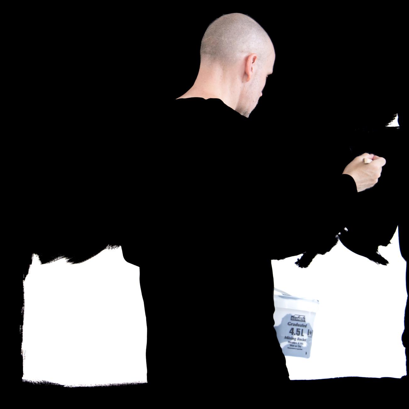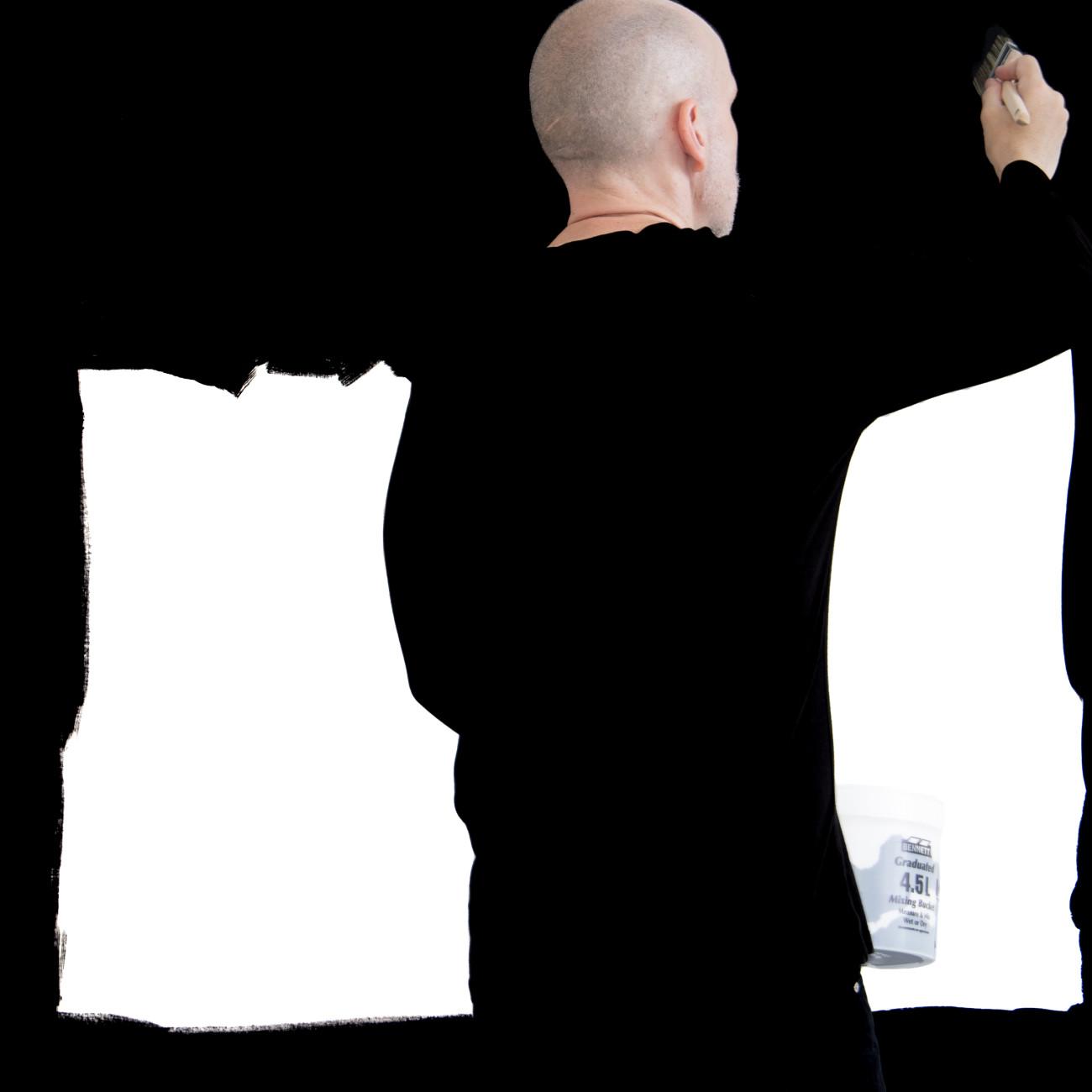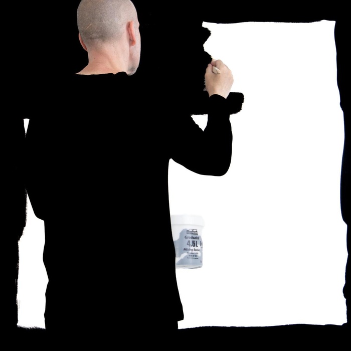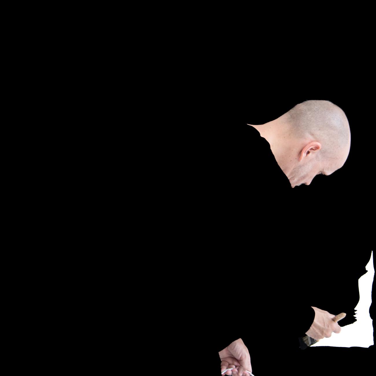 Steve Giasson. Performance invisible n.º 285 (Abstraerse (otra vez)). Reescenificación de Helena Almeida. Salída negra. 1995. Intérprete: Steve Giasson. Crédito fotográfico: Martin Vinette. Retoque fotográfico: Charles-Étienne Lebrun. Galerie B-312. 3 de agosto de 2025.