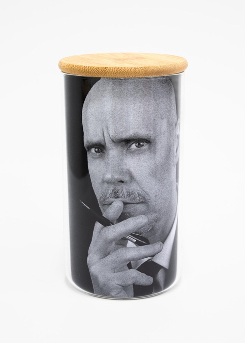 Steve Giasson. Performance invisible n.º 278 (Ser su propia mercancía). A partir de Marcel Broodthaers. Autorretrato. 1966. A partir de Marcel Broodthaers. Olla con fotografía en blanco y negro (Autorretrato). 1967. Crédito fotográfico: Martin Vinette y Charles-Étienne Lebrun. Retoques fotográficos: Charles-Étienne Lebrun. 15 de junio de 2025. -
