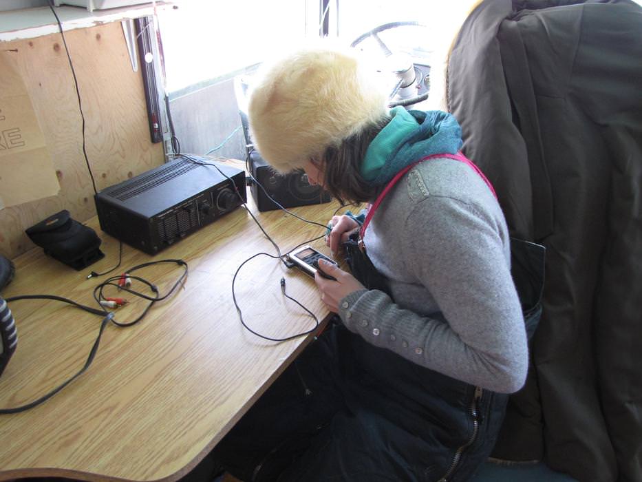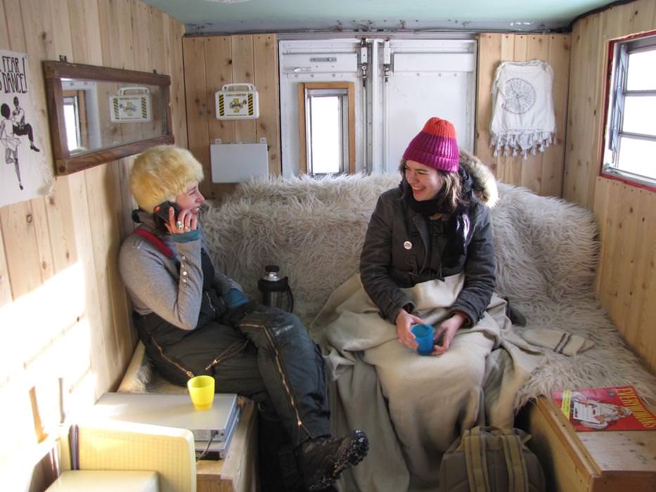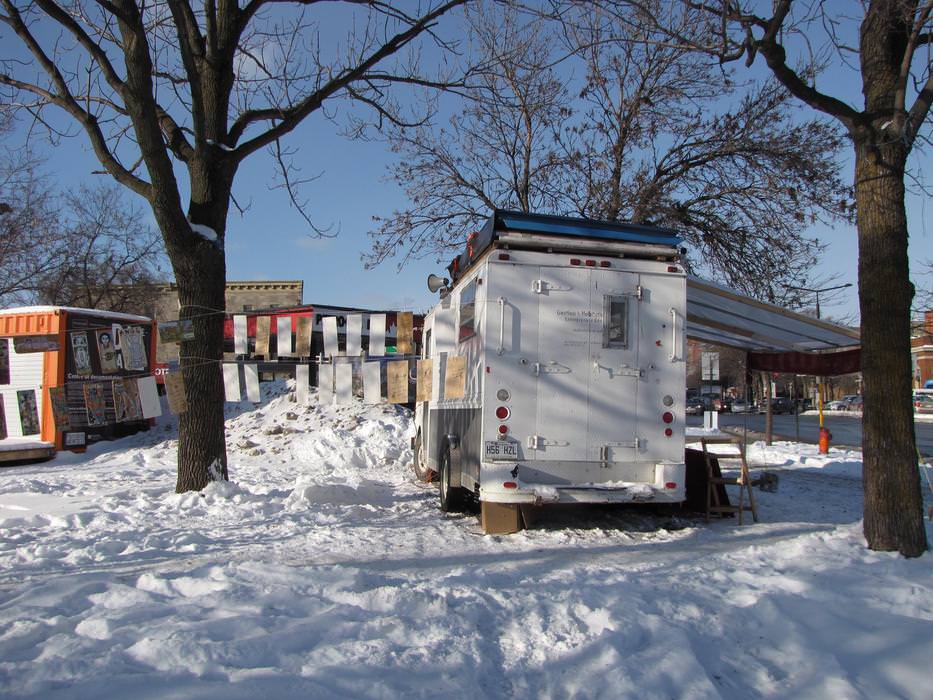 Grumman 1974. Transmisión manual. Una estructura móvil que enmarcará lo imprevisible. Blanca, con espacios pintados en pizarra; una invitación a dejar palabras.
