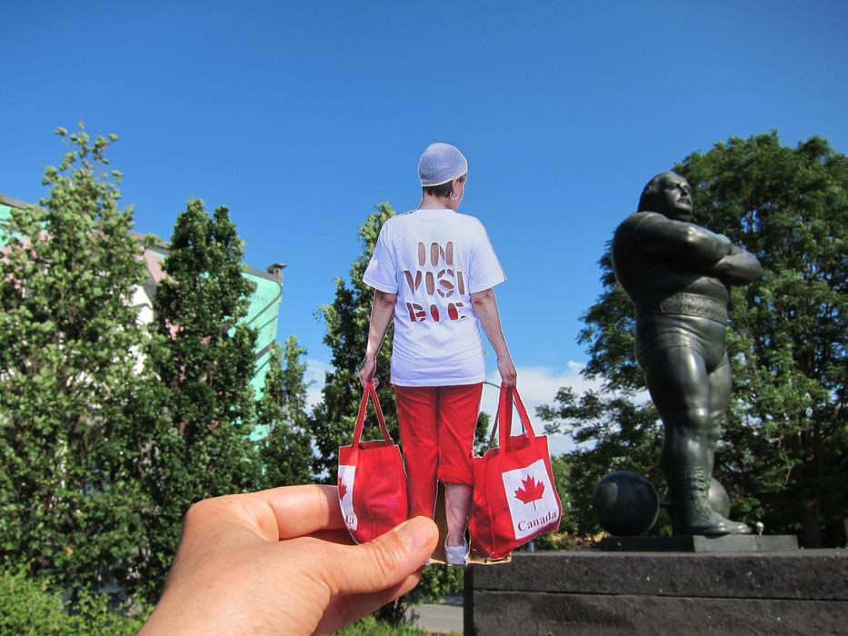 Pour la réalisation du deuxième mouvement; Mettre l’épaule *, elle a choisi la date du 20 juillet, fête nationale de son pays d’origine, la Colombie. Elle nous propose ici une nouvelle occupation du Parc des Hommes-Fort, qu’elle transformera à sa guise en espace d’atelier. Pour sa dernière sortie dans ce lieu chargé, Fritta Caro mettra en dialogue les identités nationales et les stéréotypes de genre, avec un invité spécial : « Le tablier des incarnées », objet hautement symbolique, porteur de sa mémoire affective et d’une partie de l’histoire contemporaine de la Colombie. Entre la rencontre, le chevauchement et la dissonance, les actions perpétrées par l’artiste ouvriront des brèches, à même ces monuments et emblèmes représentatifs de nations distinctes et de symboles fortement institués.