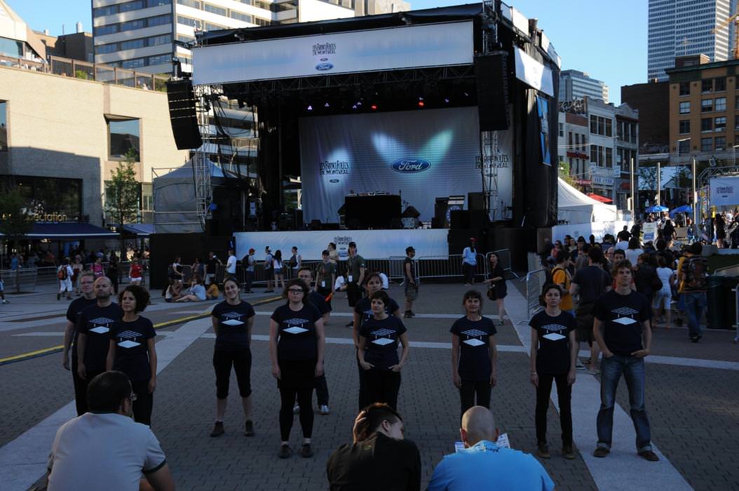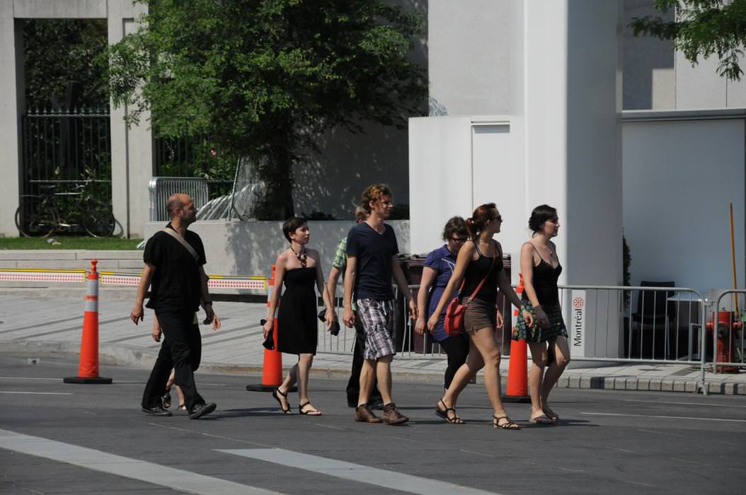 Action 3 et Action 4Suite à la tenue de l’Action 2, quelques ajustements ont été nécessaires, dont celui d’aviser le Partenariat du Quartier des spectacles et le groupe Spectra de la tenue d’une intervention et de ne plus distribuer de cartes à saveur politique. La troisième action s’est intéressée à la dimension spectaculaire et événementielle du site. Le groupe a ainsi pris part à un spectacle présenté en début de soirée en se mêlant à la foule. Lorsque le spectacle a débuté les participants se sont retournés de manière à faire face à la foule clairsemée avant de quitter l’espace de spectacles. Cette manière de confronter le spectateur à ses propres comportements, à ses propres attentes a été reprise devant deux autres publics assemblés sur le site. Les participants faisaient face aux spectateurs quelques minutes puis applaudissaient, répondant de façon ambigüe à leurs demandes de divertissements. Les réactions à ce retournement de situation inusité ont été multiples, certaines personnes étaient perplexes, mal à l’aise, alors que d’autres applaudissaient à leur tour ou encore consultaient leur programme pour identifier l’action. Les participants de Secondes zones n'ont pas seulement questionné le site, ses usages et les attentes des spectateurs, ils ont également profité de la quatrième action pour questionner leurs propres postures dans l’espace publique. Puisque même si ces derniers cherchaient à agir de manière « naturelle », une certaine mise en représentation de soi affectaient les participants, lorsqu’ils revêtaient le t-shirt aux couleurs du projet pour intervenir dans l’espace public. La quatrième action s’est donc attardée à questionner ce phénomène, à chercher à le déjouer. C’est donc avec leurs propres vêtements que les participants se sont présentés sur la place des Festivals alors en transition, puisque le Festival des Francofolies de Montréal s’apprêtait à céder la place au Festival International de Jazz de Montréal. Ils ont alors improvisé des gestes et des déplacements en groupe puis, de manière individuelle cette fois en uniforme, expérimentant un cadre ouvert aux initiatives de chacun et remettant en question leurs manières d’être dans l’espace public. Le projet Secondes zones d’Anne-Marie Ouellet soulève plusieurs enjeux, notamment sur le type d’espace public que nous souhaitons pour Montréal, sur leur manière d’être aménagés et désormais gérés. Sur ce que cette gestion apporte comme implication dans un espace social que nous aimerions pluriel, diversifié et symbolique. Il pointe également l’équilibre précaire vers lequel doit tendre l’espace public actuel entre l’élaboration de l’image de marque d’une ville et le développement de cette dernière par le biais de l’industrie culturelle, bref d’un positionnement économique à l’échelle globale et l’élaboration d’un espace de vie qui permet l’échange et l’appropriation citoyenne spontanée, qui se crée au quotidien de manière locale. Ces enjeux sont à la fois riches et complexes. Le projet Secondes zones a le mérite de les souligner et de mettre en lumière des situations qui nous paraissent banales. C’est précisément parce qu’il nous paraît normal que des événements et leurs lots de publicitaires prennent d’assaut certains espaces publics qu’il est sain d’interroger ce phénomène pour mieux revoir notre rapport à l’espace et le remettre en question.