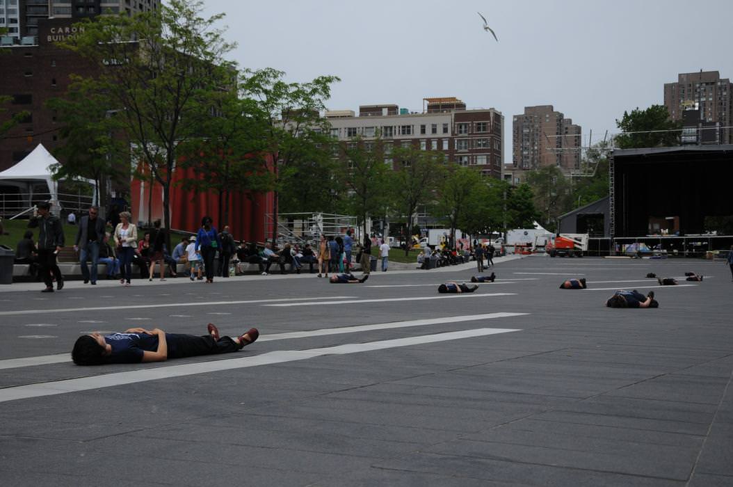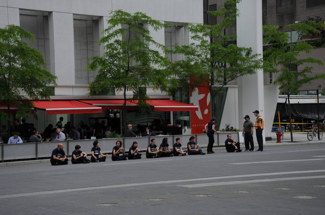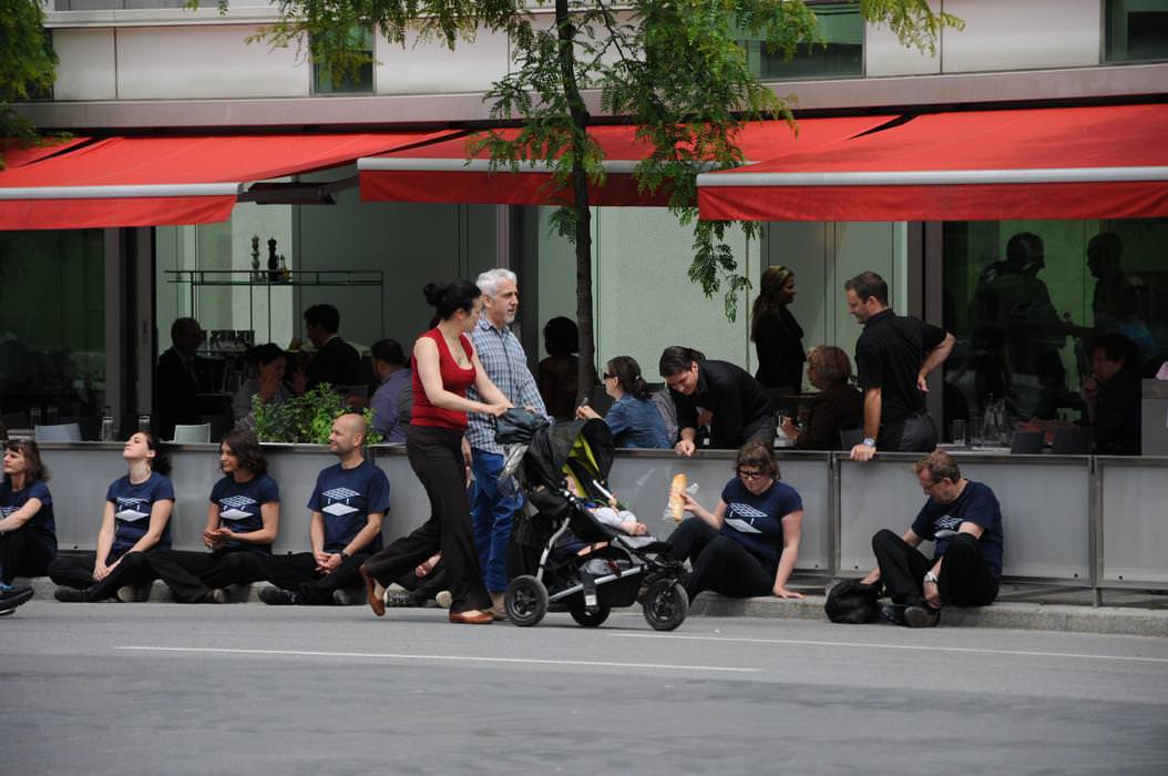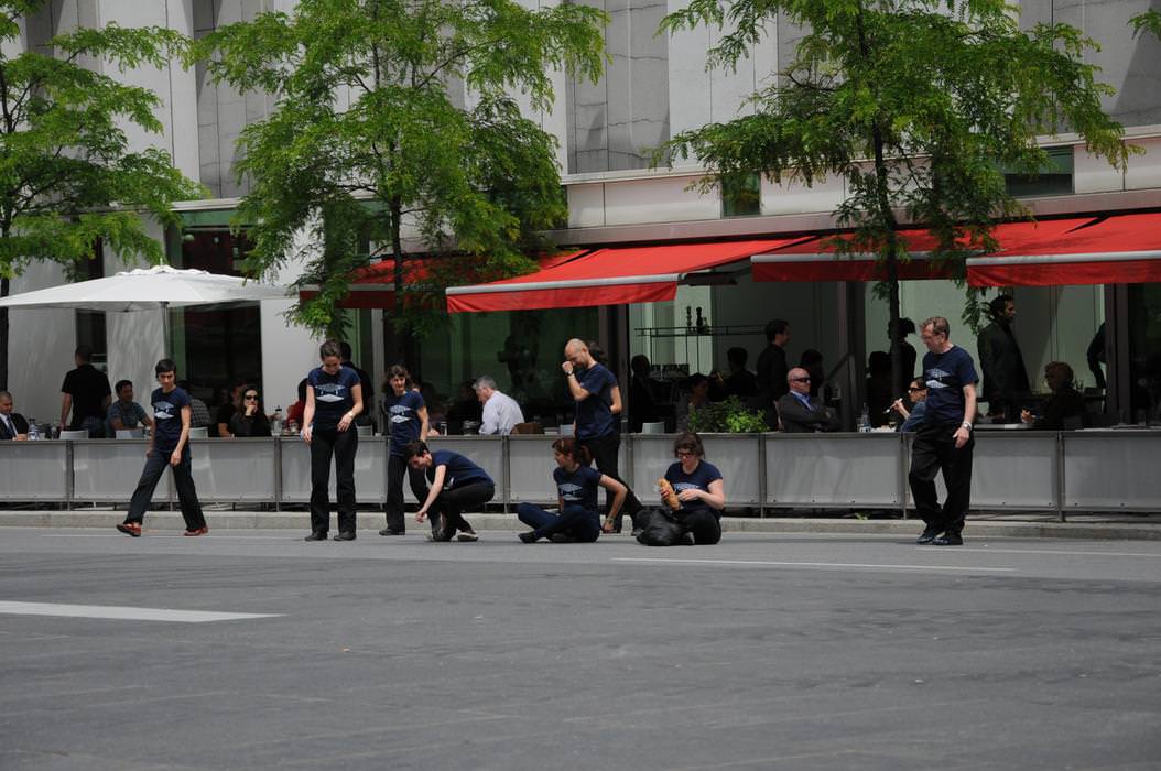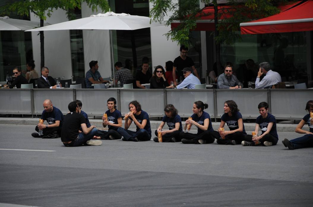 La première action, de la durée d’une quinzaine de minutes, a eu lieu le 18 mai, en groupe de 10 personnes. Elle avait été planifiée d’avance et prévoyait la mise en place d’une action donnant l’impression d’être le préambule à un spectacle, une performance ou toute autre action subséquente, qui toutefois n’arrivait pas. La performance jouait donc sur l’attente du spectateur/usager de la place ainsi que sur sa réaction face à la suite de l’action : déception, égarement, non-sens, indifférence, etc.