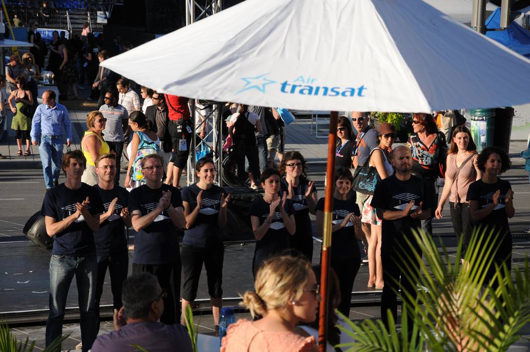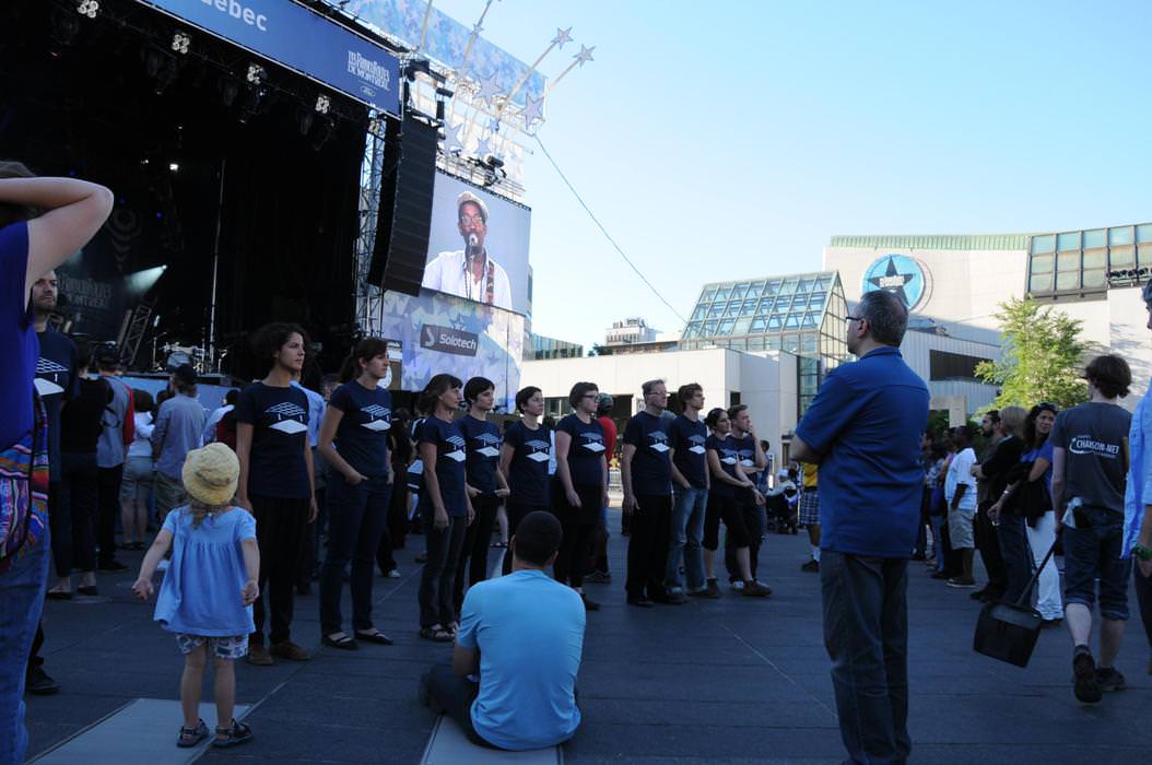 Troisième actionLa troisième action a eu lieu le 14 juin dans le cadre du Festival de jazz, dans une place transformée en espace de spectacle, hors de l’ordinaire. En réponse aux requêtes reçues, le groupe a annoncé au PQDS son déplacement sur la Place des festivals pour aller assister au spectacle en programme. Une activité rentrant à plein titre dans la norme d’usage de la place durant les festivals. Quoi de plus « normal »?