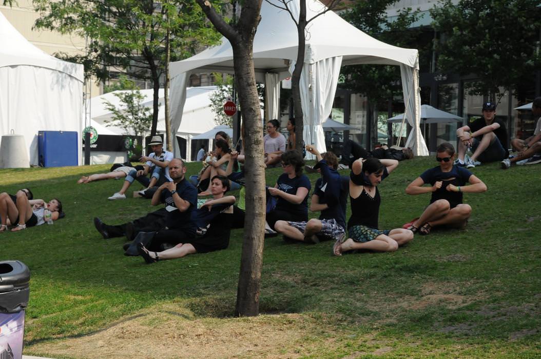 Cet écart dans l’usage a provoqué, une fois de plus, un questionnement chez les autres personnes présentes sur la place qui se sont éloignées du groupe ou ont demandé des informations. En outre, à la fin de l’action, le groupe a agi spontanément pour la première fois depuis le début du projet, ajoutant une finale non prévue. La pratique prolongée et itérative de l’espace a donc commencé à affecter l’expérience des membres du groupe, mais aussi des « contrôleurs » de la place qui ont semblé être avisés de l’action. Les préposés à l’accueil et une personne, qui s’est révélée par la suite être en lien direct avec l’organisation du festival et du PDQS, ont, en fait, interpelé le groupe durant l’action avec des commentaires très pointus et informés. Parmi ceux-ci, une question posée à un des membres du groupe ressort avec toute sa puissance : « Êtes-vous dans le groupe d’occupation de l’espace public? », demande-t-il. La réponse d’un des participants est aussi tranchante : « L'usage de l'espace public est-il un droit ou un privilège? ».